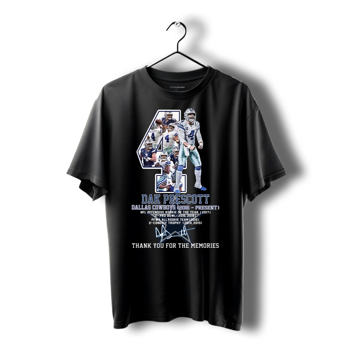 Celebrate your love for the Dallas Cowboys and honor the legacy of Dak Prescott with this fan-made graphic T-shirt. Perfect for die-hard fans and casual wearers alike, this shirt is ideal for game days, themed events, or just lounging around. Its unique design, featuring a heartfelt “Thank You For The Memories” message, captures the spirit of camaraderie and pride, making it a must-have addition to any Cowboys enthusiast’s wardrobe.