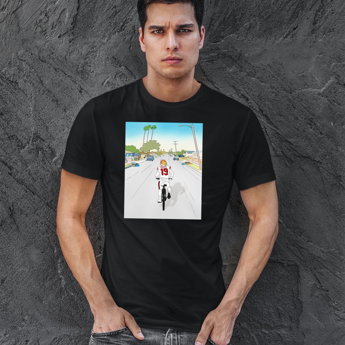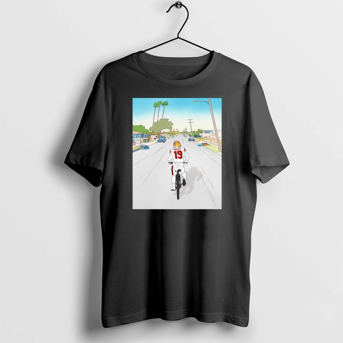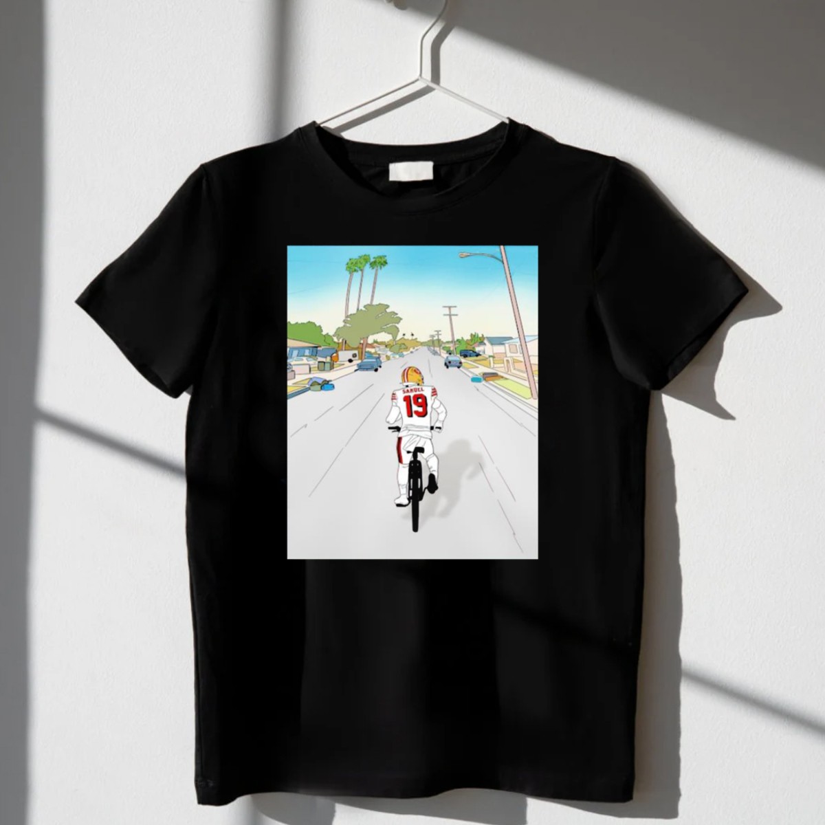Show off your love for the 49ers and the iconic Deebo Samuel with this unique graphic T-shirt, perfect for any dedicated fan. Featuring a playful design of Deebo riding a bicycle through a suburban neighborhood, this shirt is ideal for casual outings, themed events, or simply relaxing at home. Crafted for comfort and style, it’s a must-have for anyone who wants to celebrate their team in a fun and creative way.