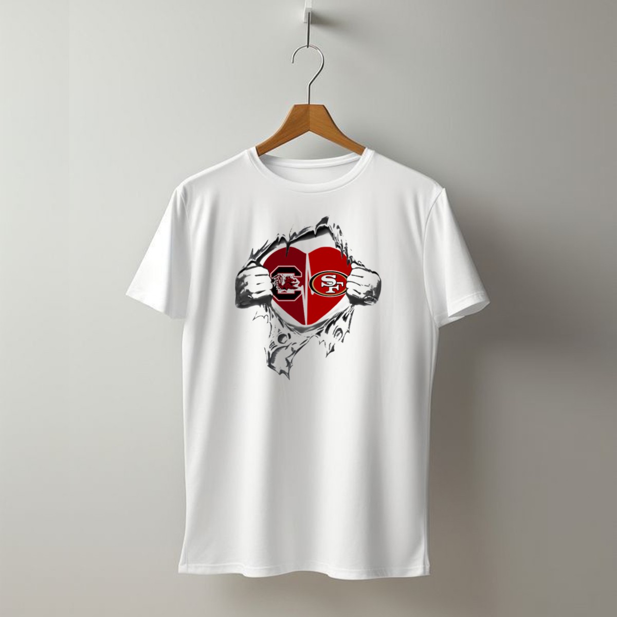 Show your love for both the 49ers and Gamecocks with this uniquely designed T-shirt, perfect for fans who celebrate their passion for sports and state pride. Crafted for comfort and style, this shirt is ideal for casual outings, themed events, or just lounging at home. The fan-made design, printed in the USA, makes it a standout piece for any true supporter.