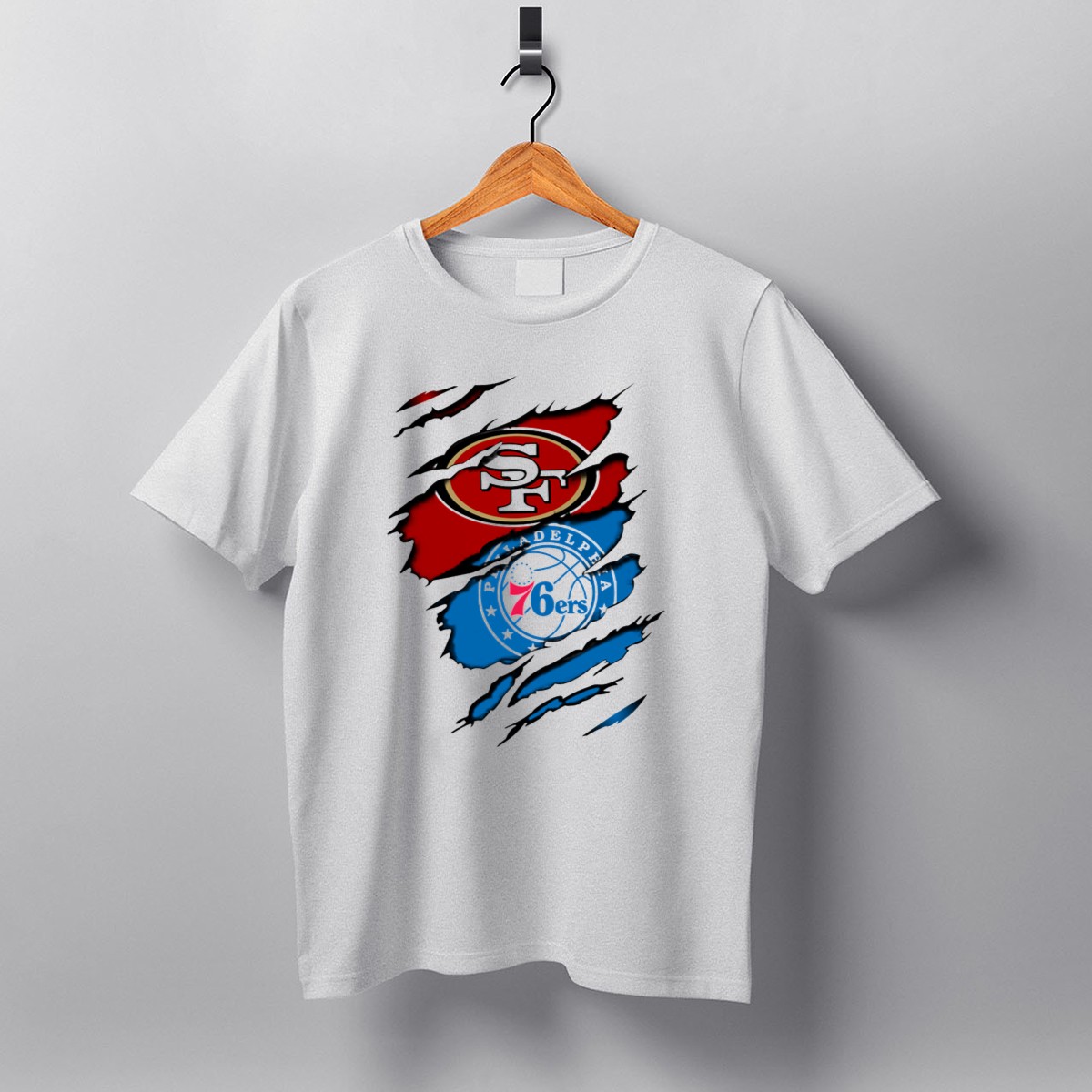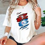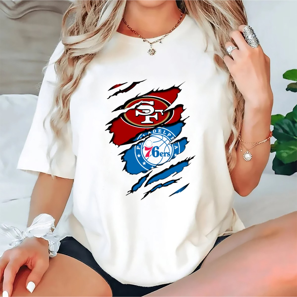 Show off your team spirit with our fan-made 49Ers SF 76Ers Philadelphia Logos In Scratched T-Shirt! Perfect for die-hard fans and casual wearers alike, this unique design captures the essence of your favorite teams in a stylish and comfortable way. Whether you’re heading to a game, a themed event, or just hanging out with friends, this shirt will make you stand out while keeping you comfy. Proudly printed in the USA, it’s a must-have for any sports enthusiast!