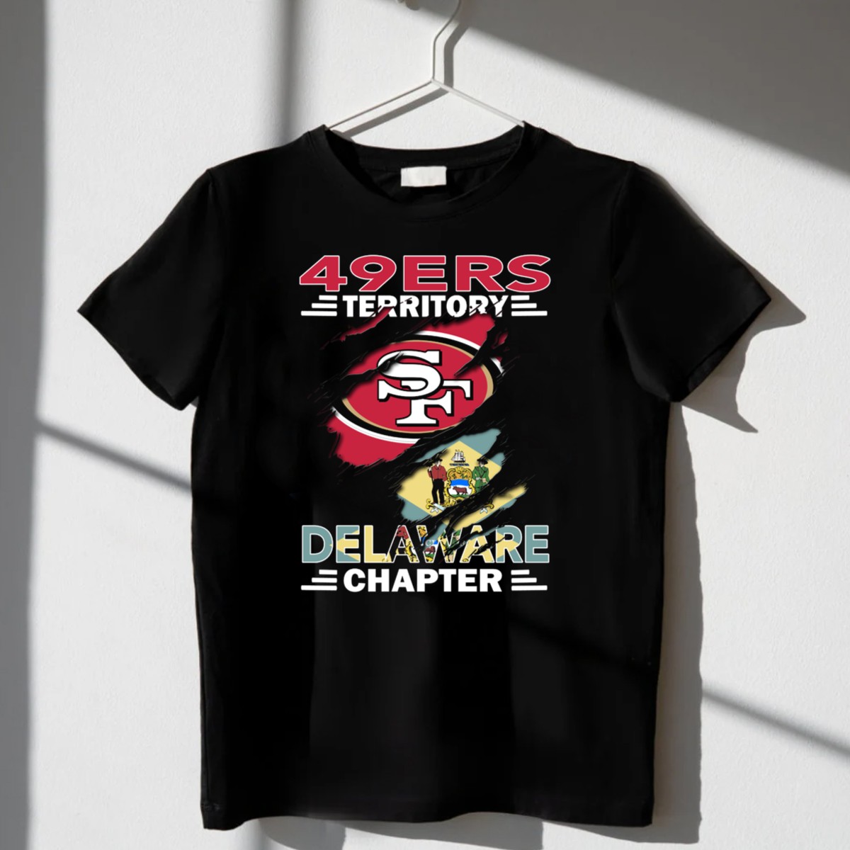 Show your pride for the 49Ers with our exclusive 49Ers Territory SF Logo Delaware Chapter T-Shirt! Perfect for fans and supporters, this shirt is an ideal choice for casual outings, themed events, or just daily wear. Made with a soft and breathable fabric, it combines comfort with a striking design that showcases your love for the team, making it a unique addition to your wardrobe.