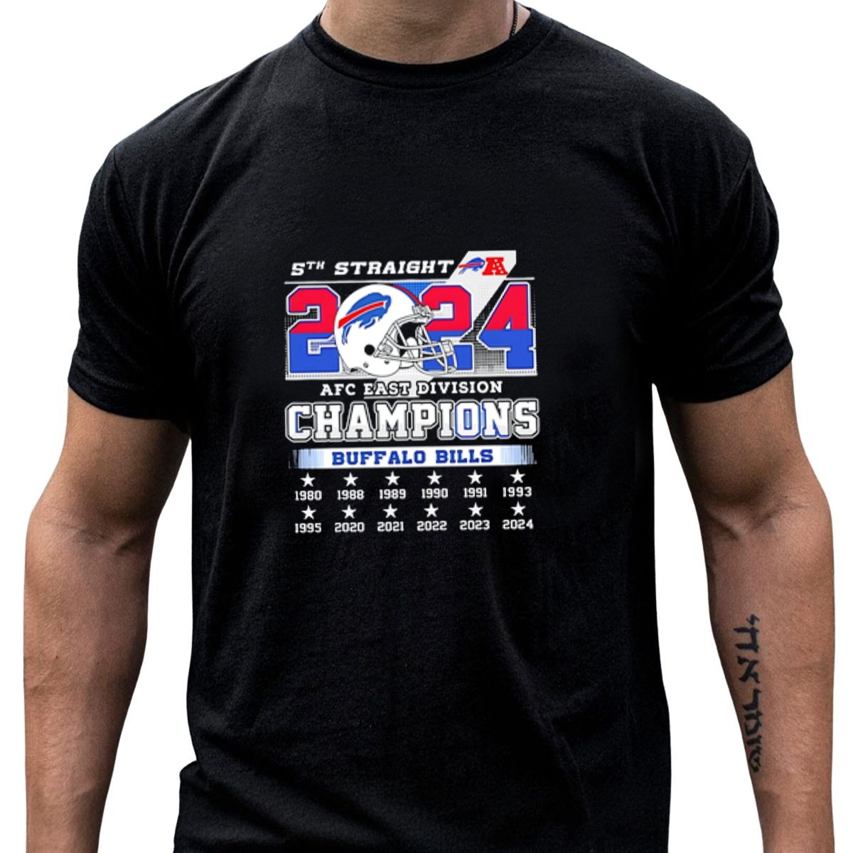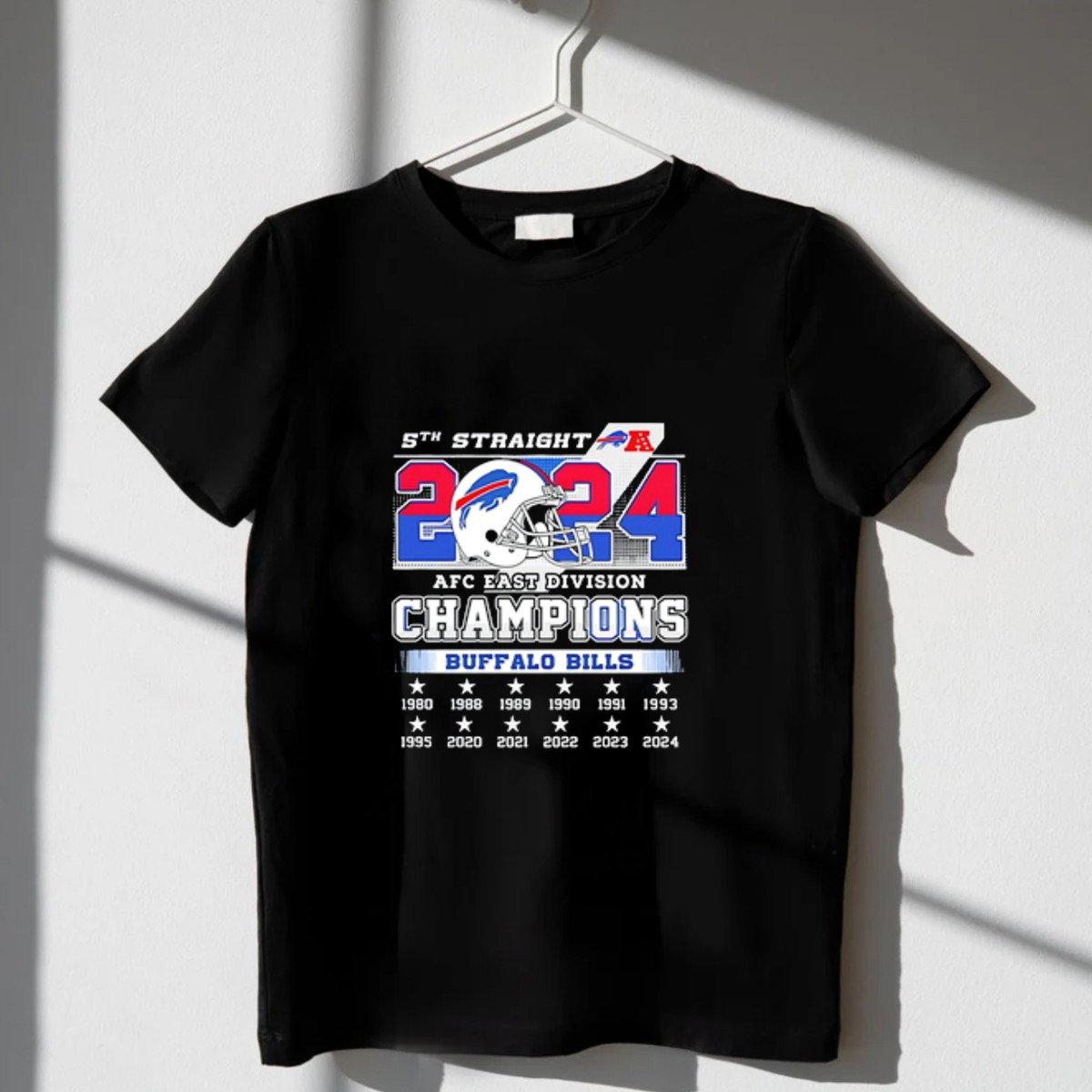 Show your unwavering support for the Buffalo Bills with this fan-made graphic T-shirt celebrating their triumphant 5th Straight AFC East Division Championship! Perfect for die-hard fans and casual wearers alike, this shirt is ideal for game days, themed events, or just hanging out with friends. Crafted with a unique design that showcases the iconic helmet logo and stars, it’s a must-have for any Bills enthusiast looking to make a statement.