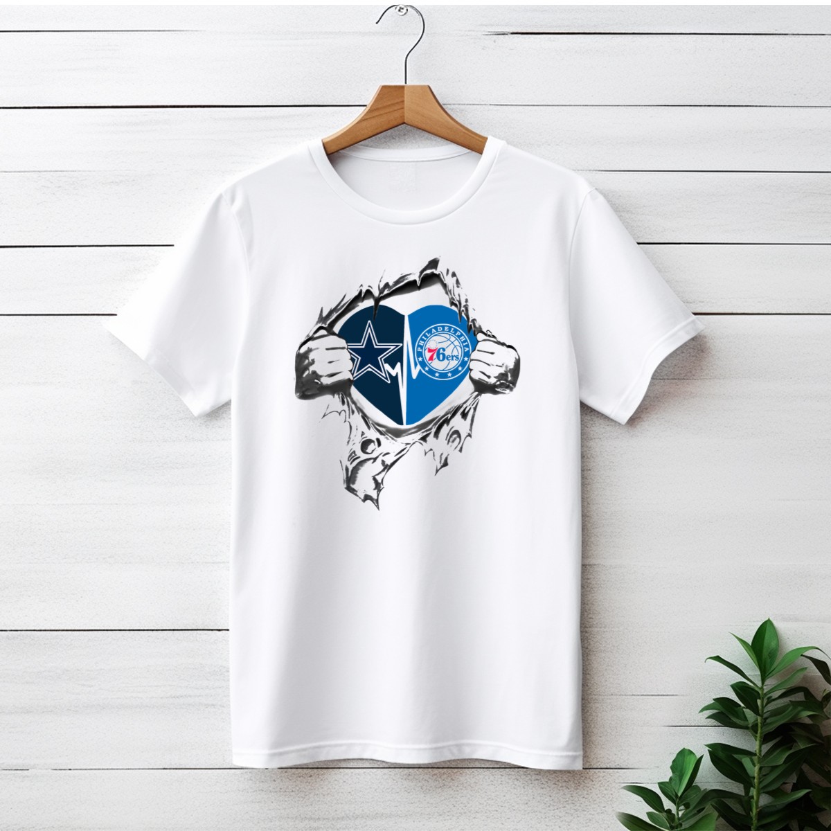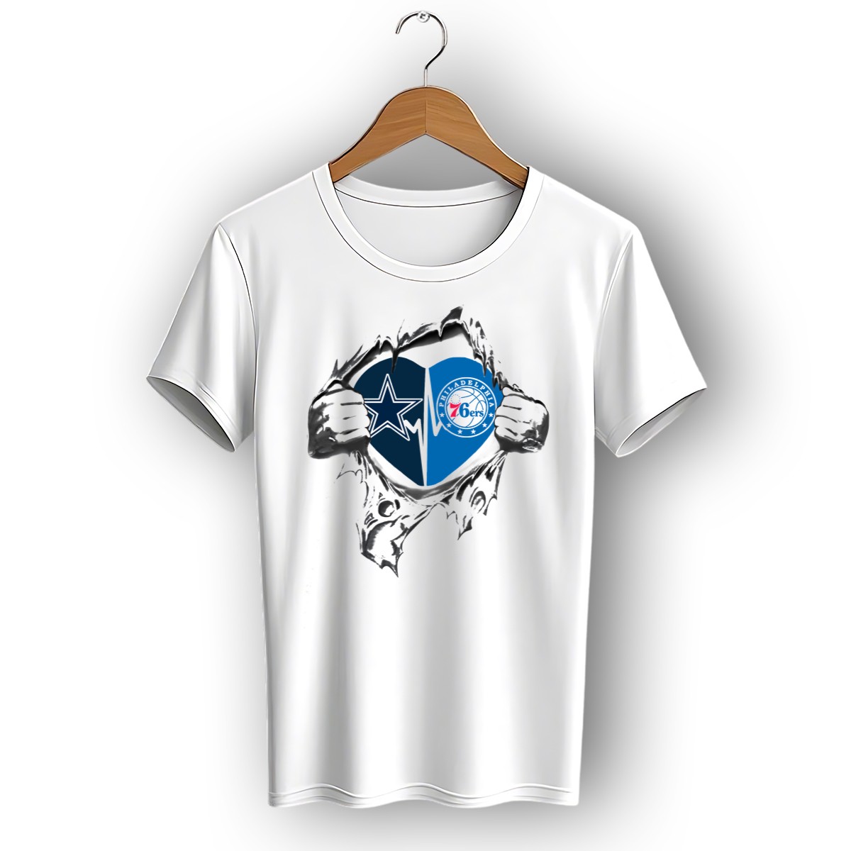 Show your unwavering support for both the Dallas Cowboys and the Philadelphia 76Ers with this fan-made graphic printed T-shirt. Perfect for die-hard fans and casual wearers alike, this shirt is ideal for game days, themed events, or just lounging at home. Made in the USA, it combines a unique design with comfort, making it a standout piece in any sports enthusiast’s wardrobe.