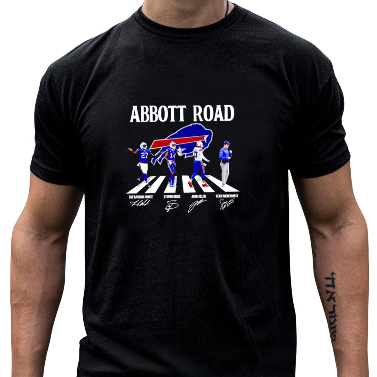 Show your unwavering support for the Buffalo Bills with our fan-made Abbott Road T-Shirt, featuring iconic players TreDavious White, Stefon Diggs, and Josh Allen, along with coach Sean McDermott. This classic fit tee is perfect for any casual occasion, from game days to themed events, allowing you to showcase your team pride in style. Made with 100% cotton, this shirt promises comfort and durability, making it a go-to choice for daily wear all season long.