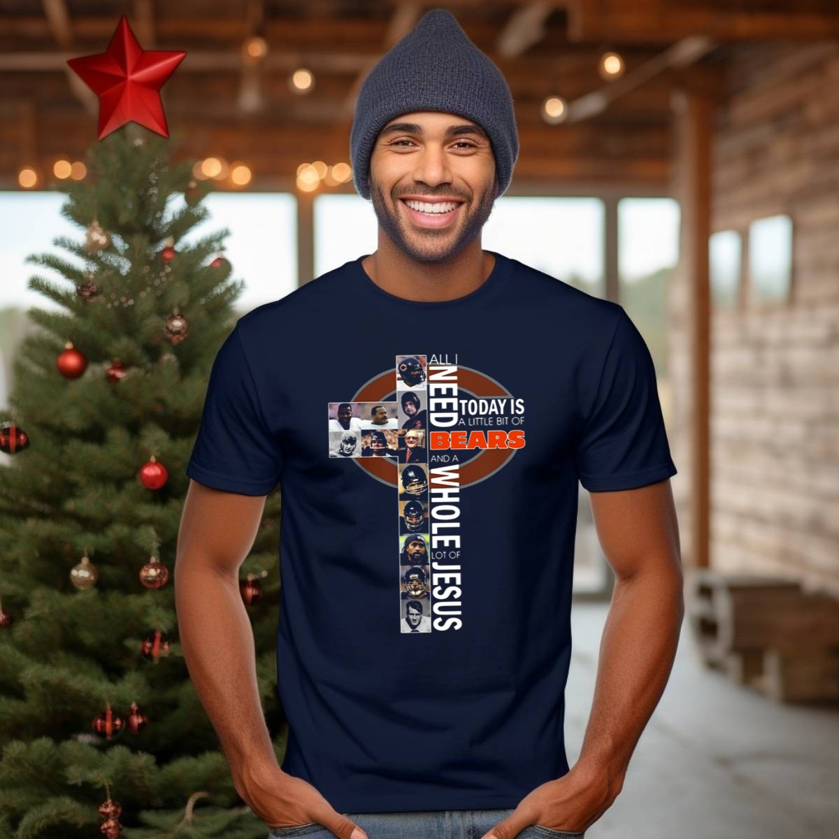 Embrace your faith and your love for the game with our “All I Need Today Is A Little Bit Of Bears And A Whole Lot Of Jesus” T-shirt, perfect for die-hard Chicago Bears fans who cherish their team and their beliefs. This fan-made design, proudly printed in the USA, is ideal for casual outings, themed events, or everyday wear. With its classic fit and comfortable fabric, this shirt is not just a statement piece but a celebration of your passion and devotion.