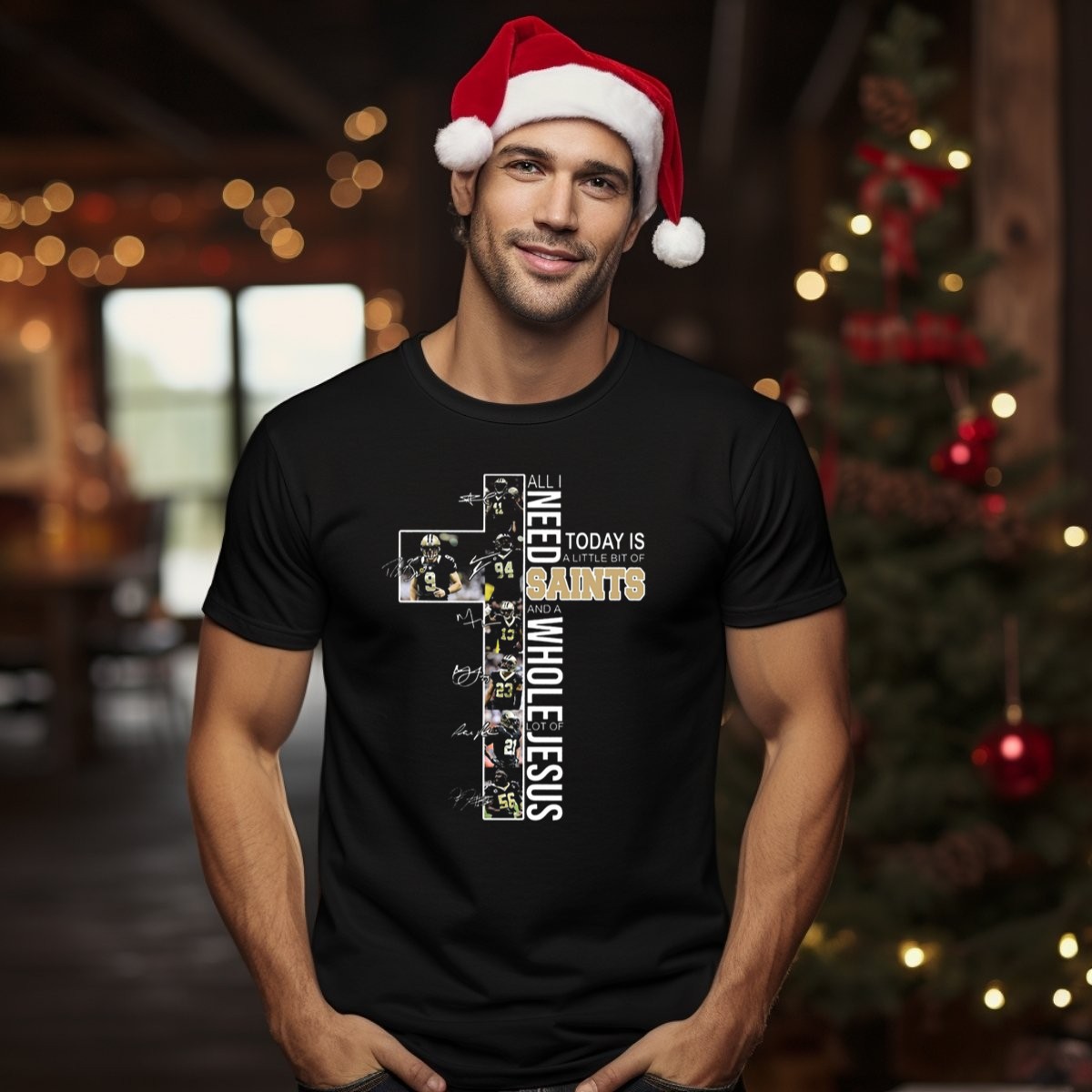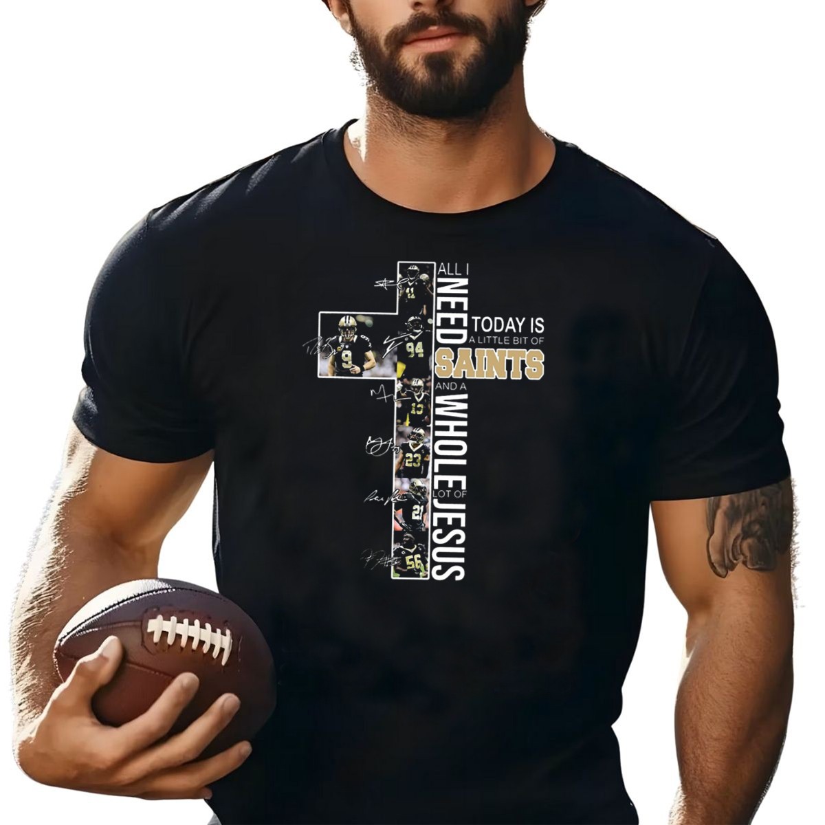 Celebrate your passion for football and your faith with our “All I Need Today Is A Little Bit Of Saints And A Whole Lot Of Jesus” graphic printed T-shirt. Perfect for fans of the game, this shirt combines casual comfort with a heartfelt message, making it ideal for themed events, casual outings, or daily wear. Crafted for both men and women, its unique design is sure to resonate with fellow fans and spark conversations wherever you go.