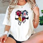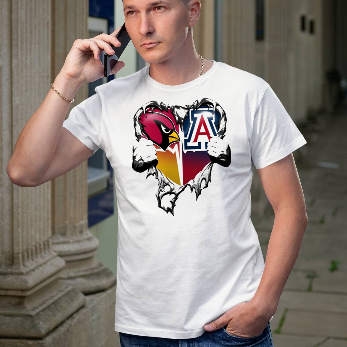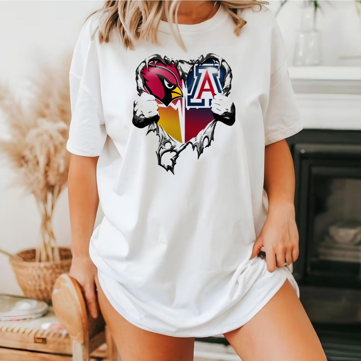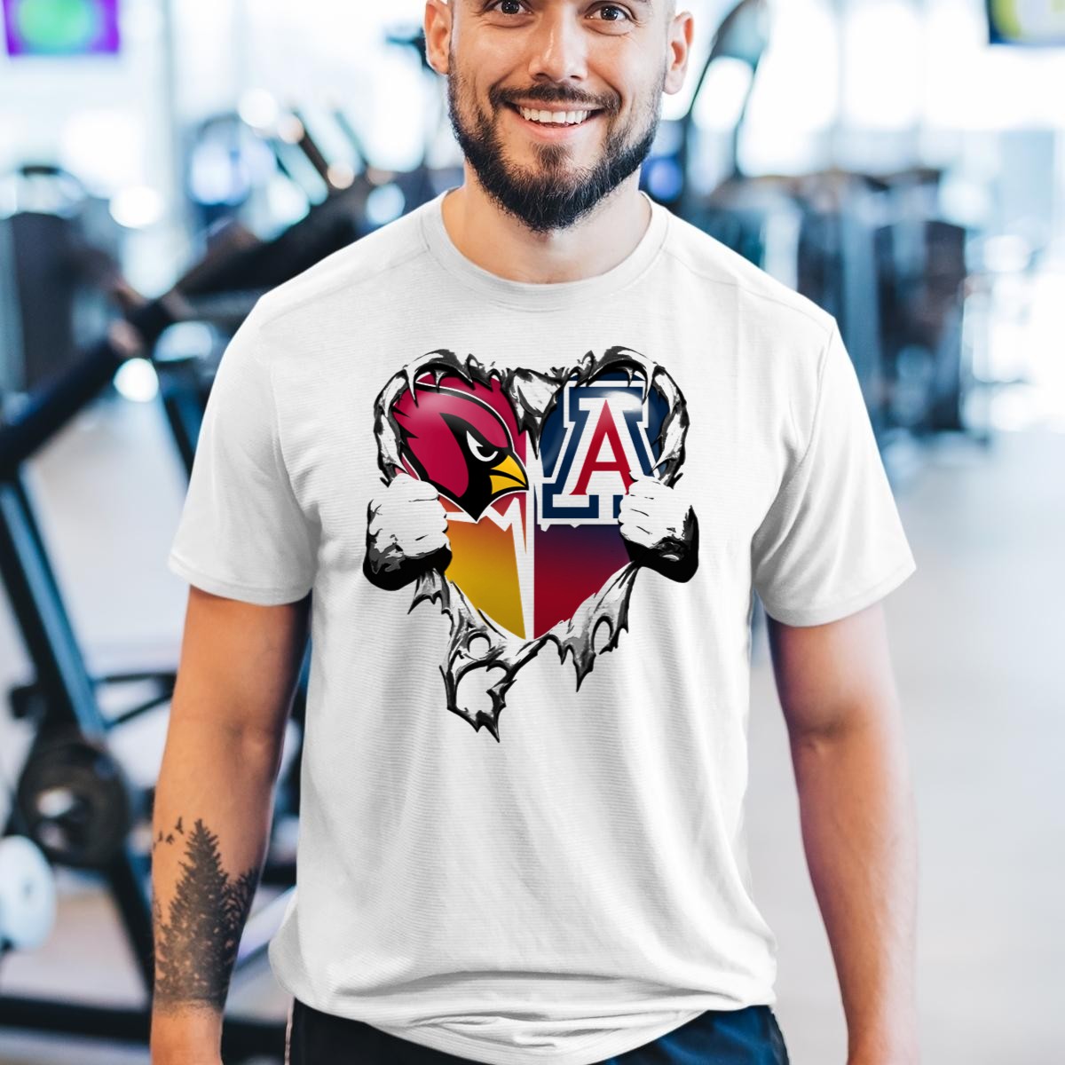 Show your love for Arizona sports with our Arizona Cardinals and Arizona Wildcats Heart Tear T-Shirt! This fan-made design is perfect for die-hard supporters looking to express their passion for both teams. Ideal for casual outings, themed events, or daily wear, this shirt combines comfort and style, making it a must-have for any Arizona sports enthusiast. Proudly printed in the USA, it’s not just a shirt; it’s a statement!