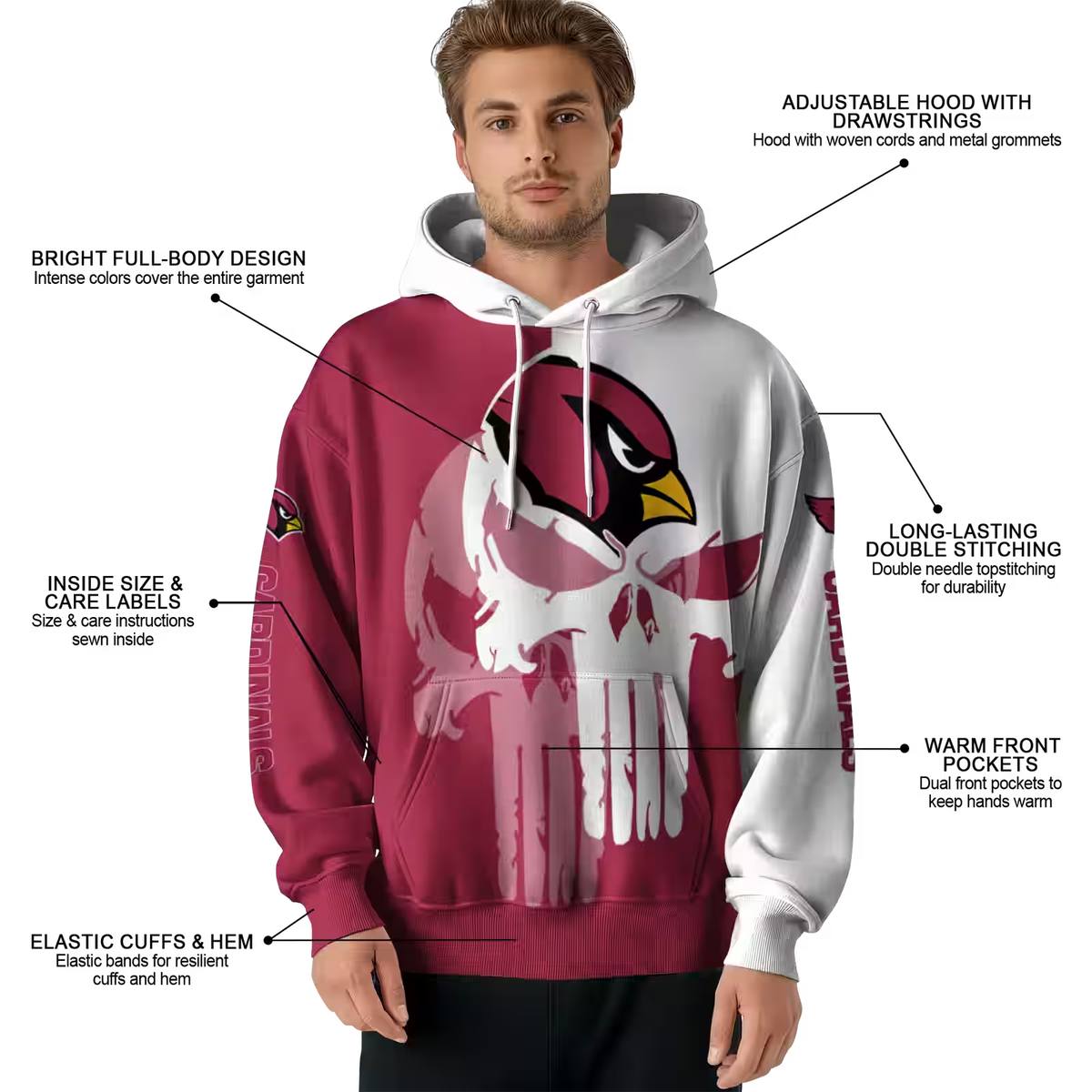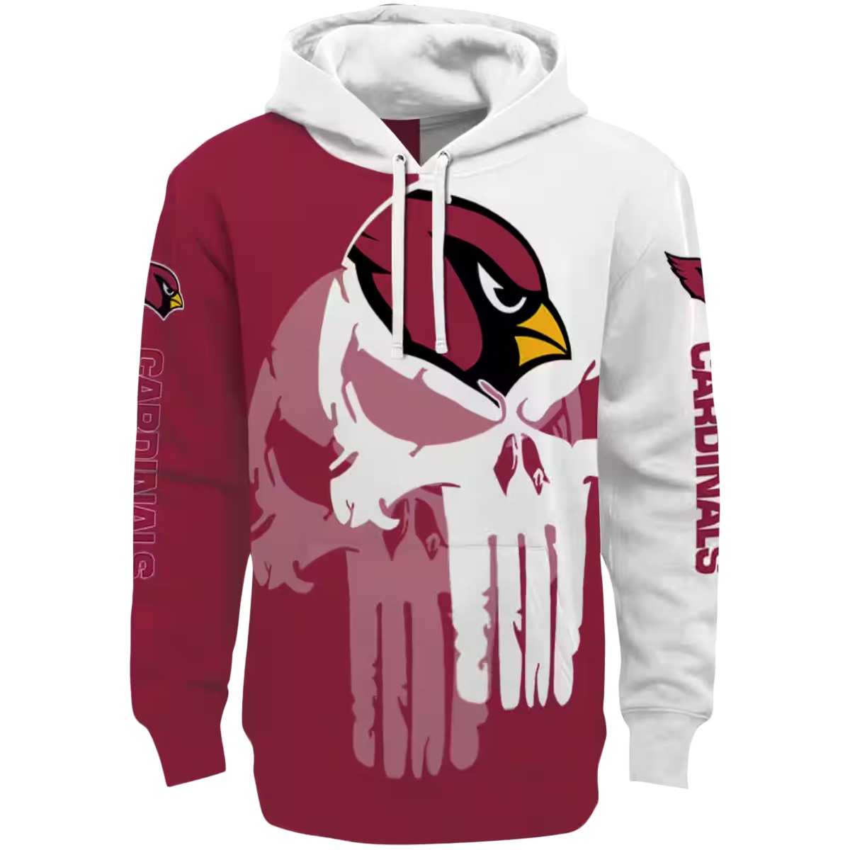 Unleash your team spirit with the Arizona Cardinals Graphic Punisher Skull Red White All-Over Print Hoodie. Perfect for die-hard fans and anyone who loves to showcase their bold style, this hoodie is ideal for casual outings or cozy evenings at home. Its unique design sets it apart, making it a standout piece in any wardrobe.