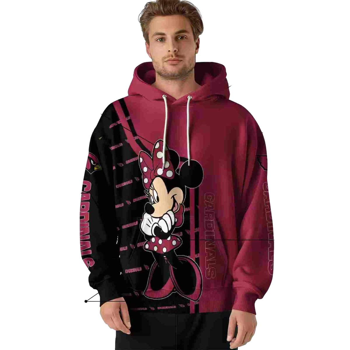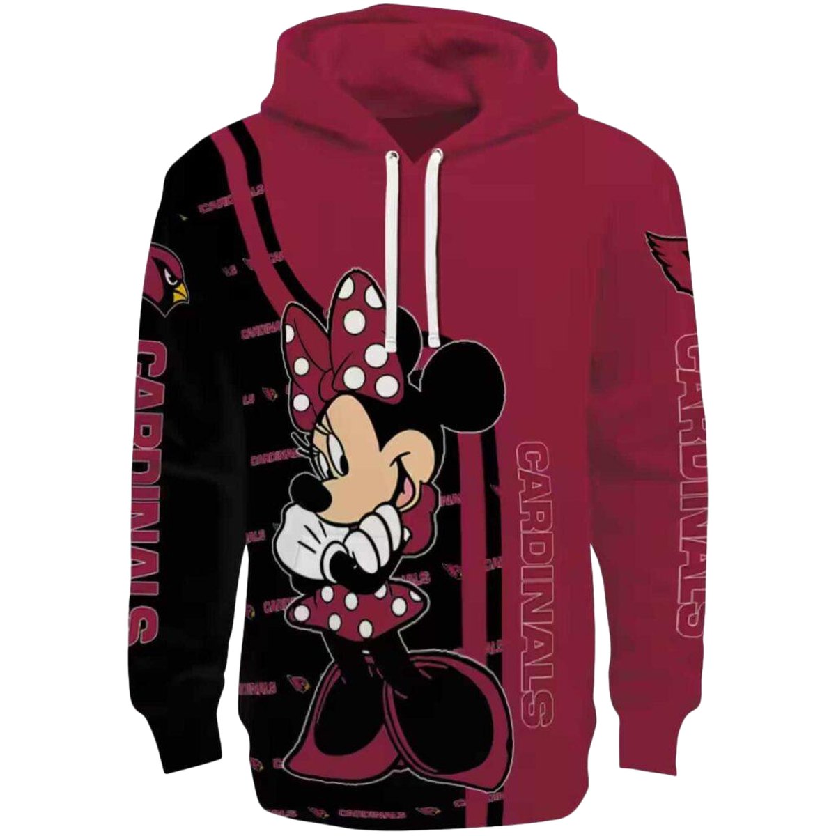 Show off your love for both the Arizona Cardinals and the whimsical charm of Minnie Mouse with our all-over printed hoodie. Perfect for fans of all ages, this cozy yet lightweight hoodie is ideal for daily wear or casual outdoor activities during the cooler months. Its unique design brings together vibrant graphics that celebrate your favorite team in a fun, playful way.