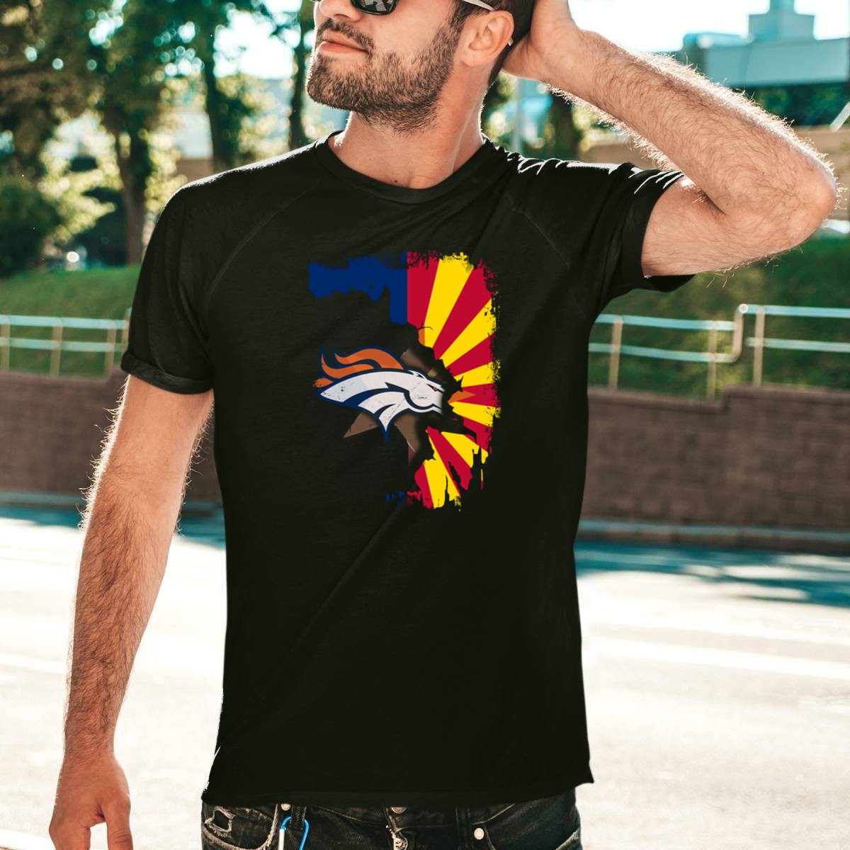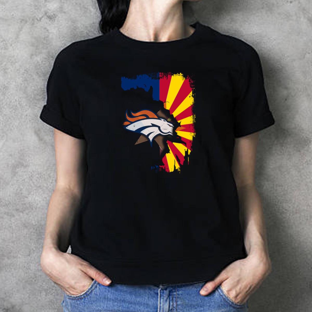 Show your team spirit with our Arizona Flag and Denver Broncos Logo Fusion T-Shirt! This fan-made design is perfect for any devoted Broncos supporter, blending the vibrant colors of the Arizona flag with the iconic Denver Broncos logo. Whether you’re cheering from the stands, attending a themed event, or just enjoying a casual day out, this shirt is a stylish way to showcase your allegiance. Crafted for comfort and style, it’s a must-have for every football fan!