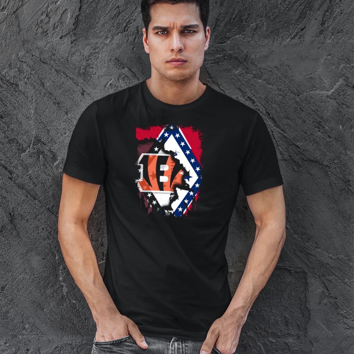 Show your pride with our Arkansas Flag Merged With Cincinnati Bengals T-Shirt, a perfect blend for fans who love to represent their roots and their team. This unique design is ideal for casual outings, themed events, or simply lounging around while cheering for your favorite football squad. Crafted for comfort and style, this shirt is printed in the USA, ensuring you wear a piece that resonates with both your identity and passion.