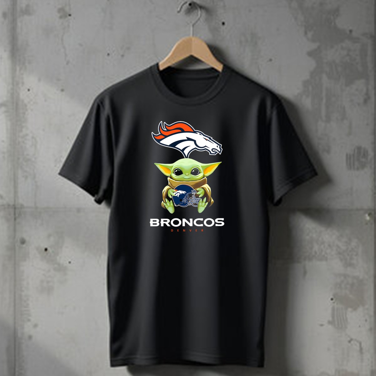 Baby Yoda Holding Denver Broncos Helmet with Broncos T-Shirt