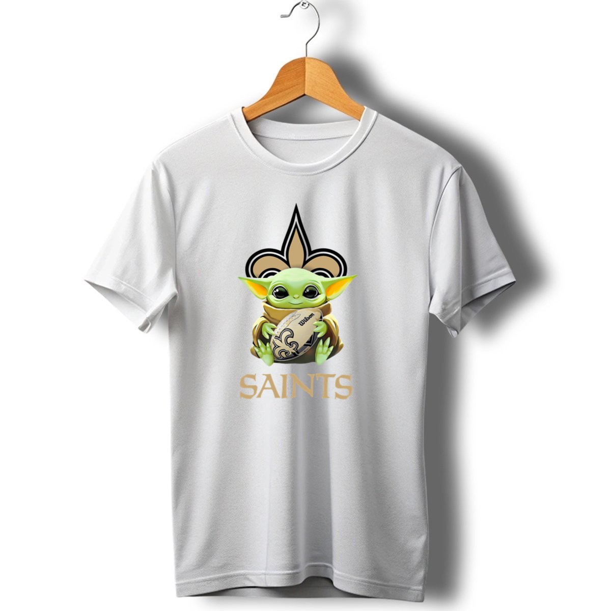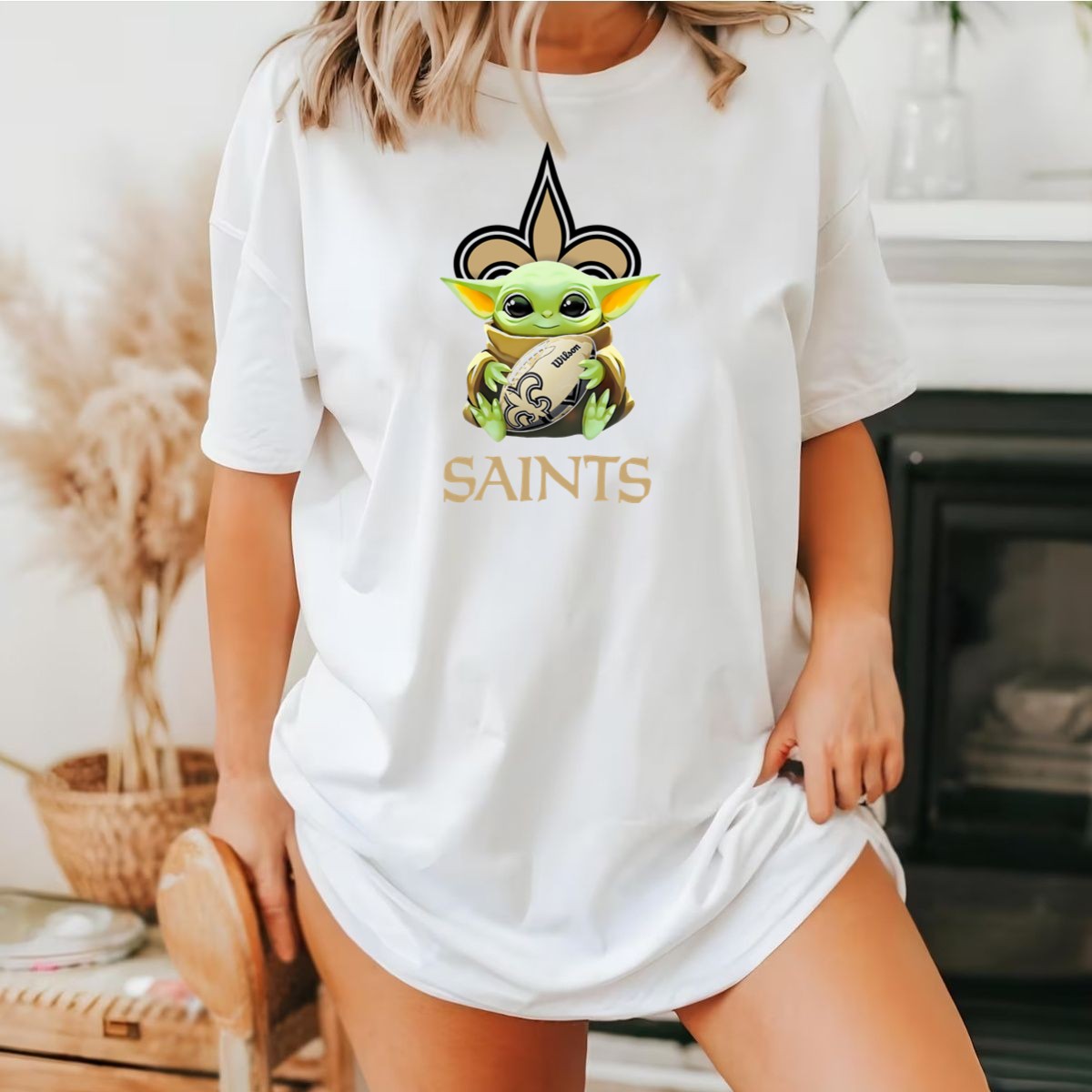Show off your love for the New Orleans Saints and the adorable Baby Yoda with this unique graphic printed T-shirt! Perfect for fans of all ages, this shirt captures the spirit of the game while adding a playful touch to your casual wardrobe. Ideal for game days, themed events, or just lounging around, this fan-made design celebrates your passion with style and comfort, all proudly printed in the USA.