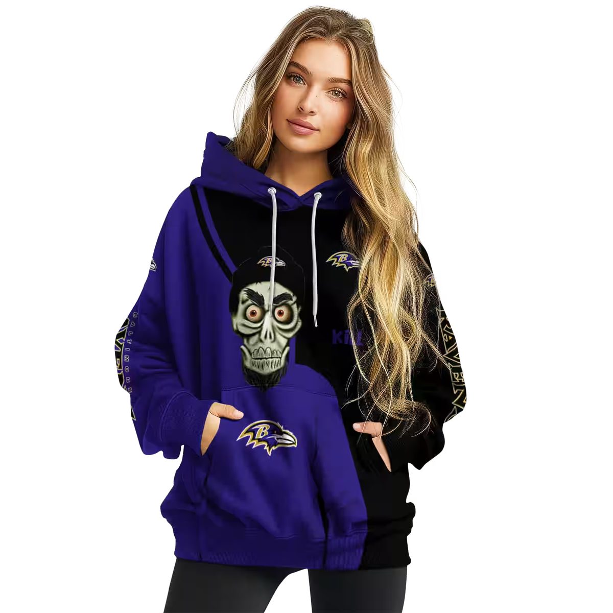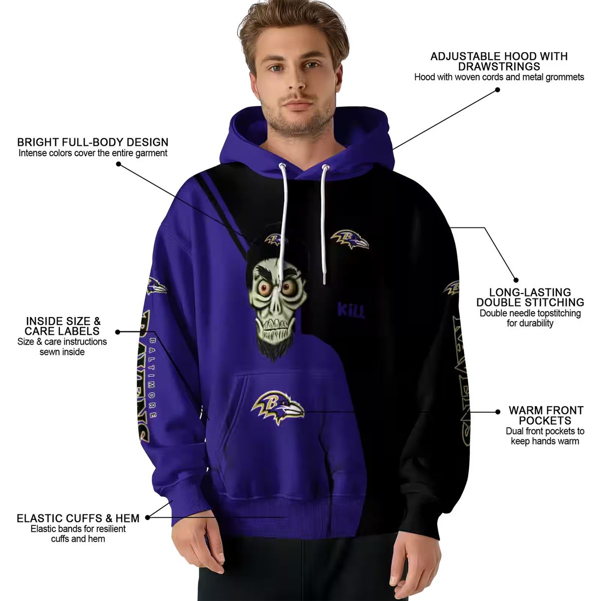 Embrace your bold side with our Baltimore Ravens Achmed Skull Purple Black AOP Hoodie, designed for fans who want to showcase their unique style while staying cozy. Perfect for daily wear or casual outdoor activities during the cooler months, this unisex hoodie offers a relaxed fit that caters to both men and women, making it an essential addition to your wardrobe.