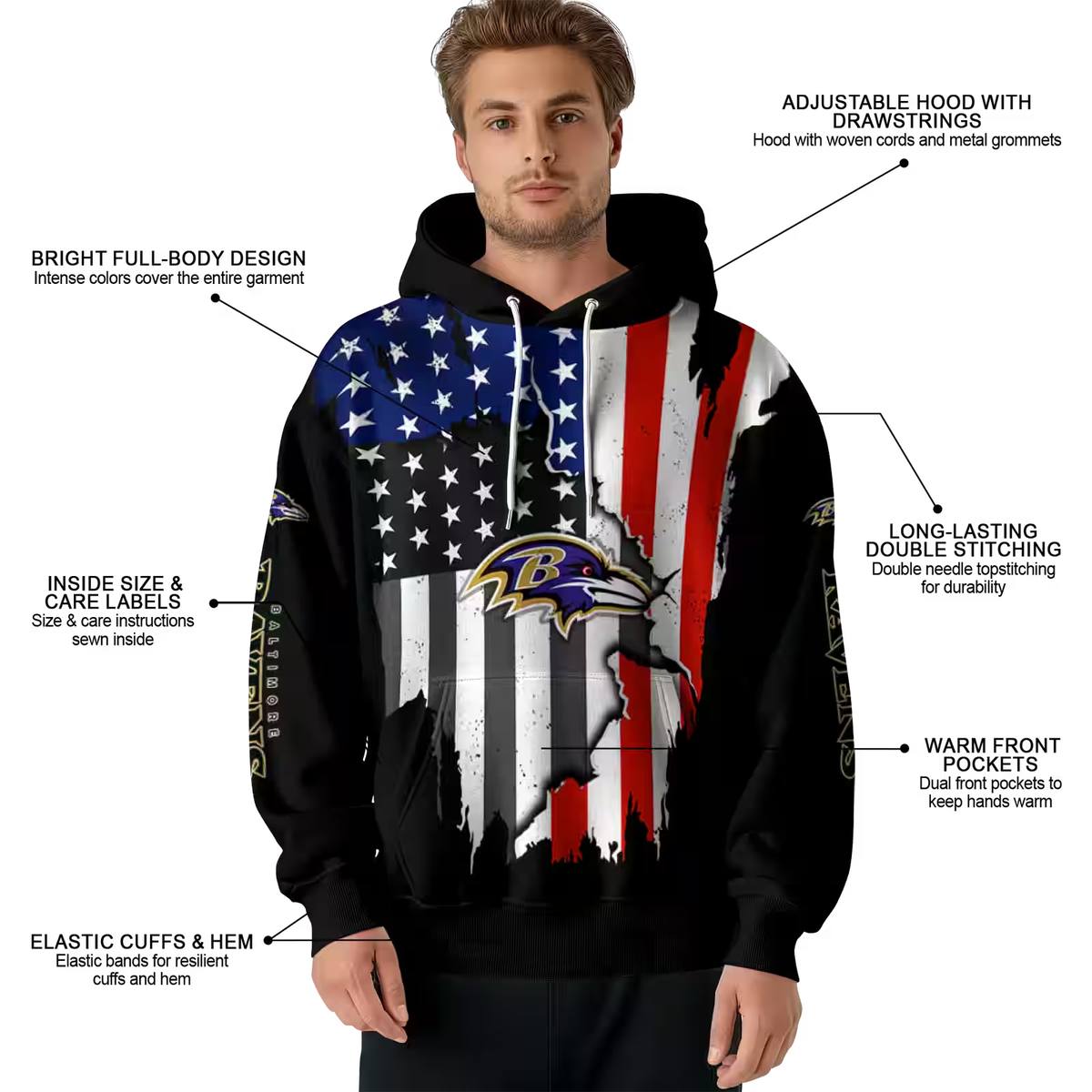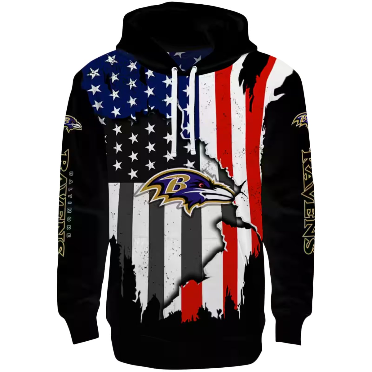 Show your support for the Baltimore Ravens with our American Pride Black AOP Hoodie, designed for fans who embrace both comfort and style. This hoodie is perfect for daily wear or casual outdoor activities during the cooler months, making it an essential addition to your wardrobe. With its unique all-over print and relaxed fit, it’s a standout piece that combines team spirit with a cozy feel.