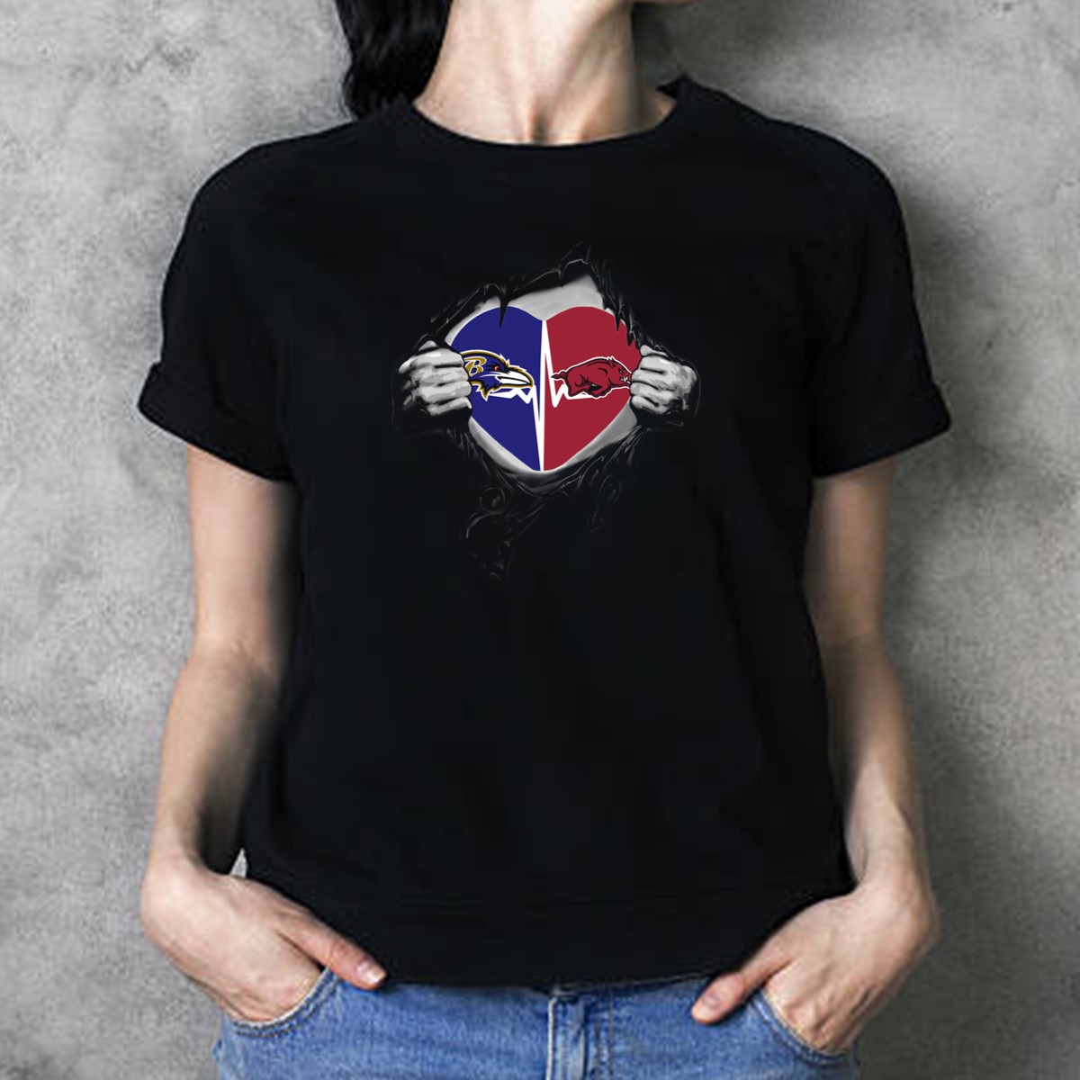 Show your love for both the Baltimore Ravens and Arkansas Razorbacks with this unique fan-made graphic T-shirt! Perfect for sports enthusiasts who want to showcase their team spirit in a stylish and comfortable way, this shirt is ideal for casual outings, themed events, or just lounging around. Made in the USA, the heart logo combo design sets it apart, making it a must-have for any dedicated fan.