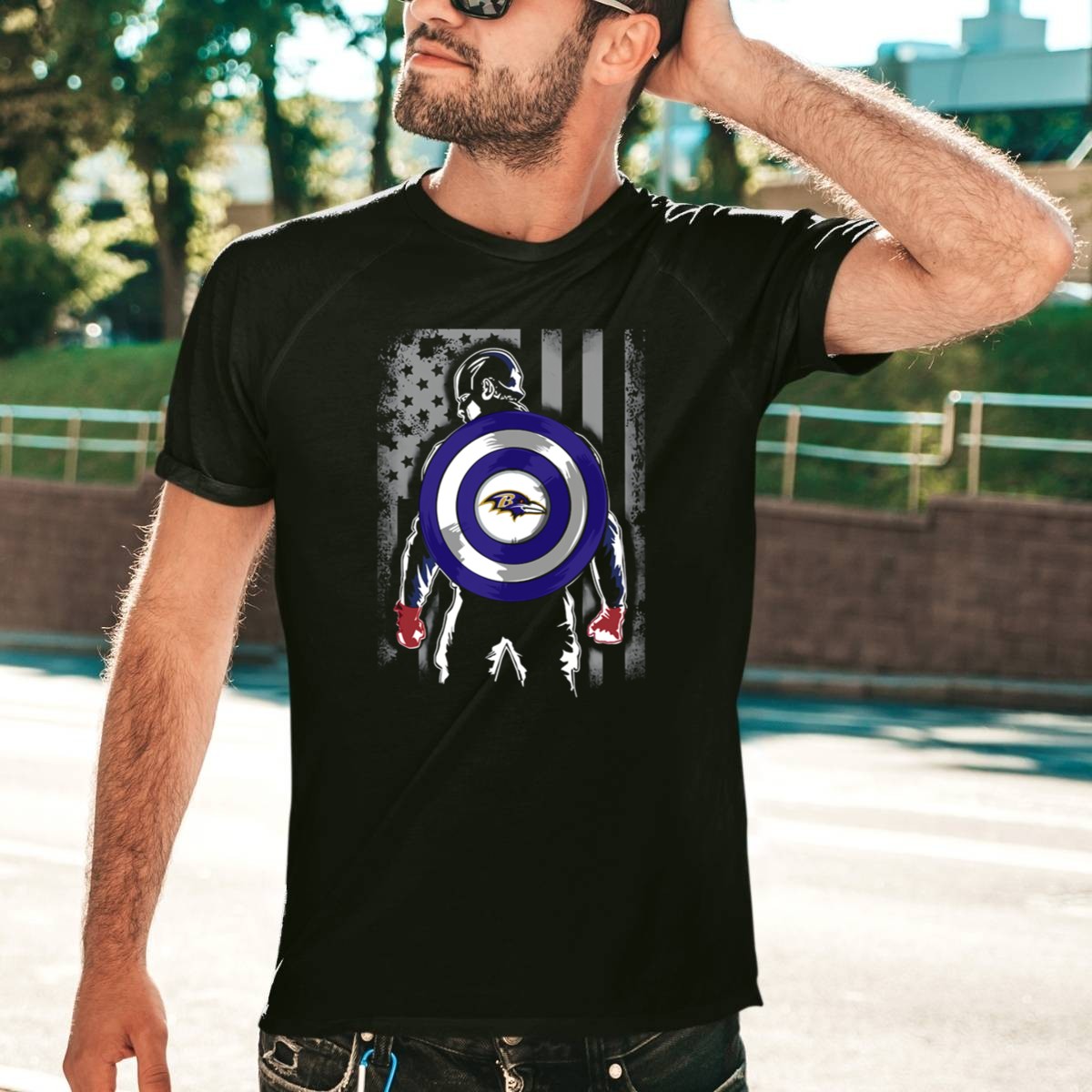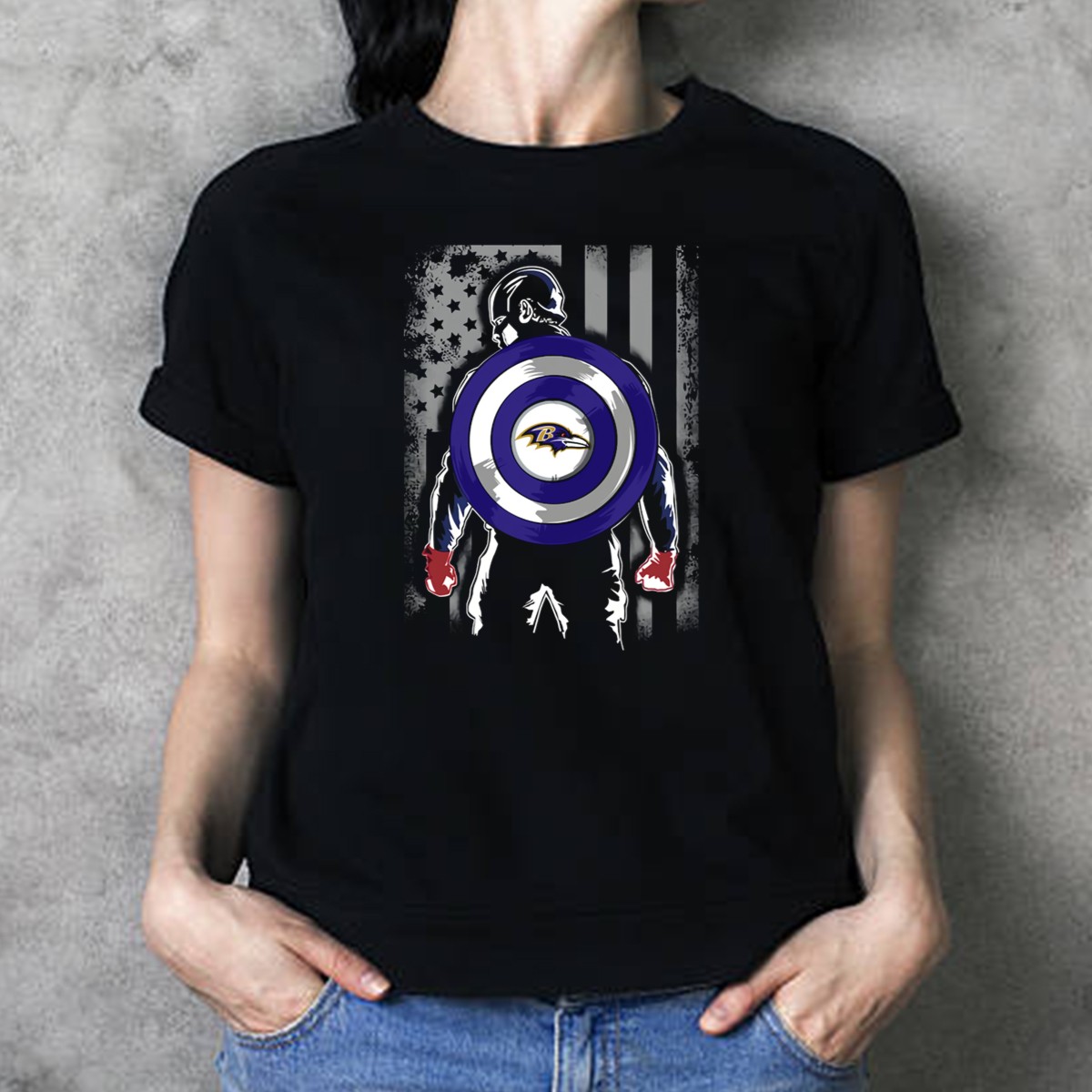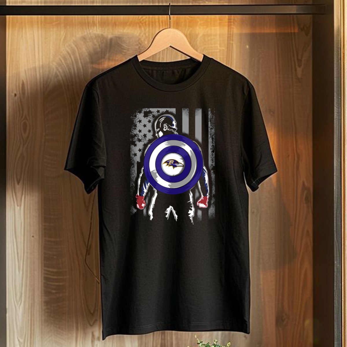 Show off your team spirit with this unique Baltimore Ravens Captain America Shield Flag T-Shirt! Perfect for die-hard fans, this shirt combines the love for your favorite NFL team with a patriotic twist, making it ideal for casual outings, themed events, or daily wear. Made with high-quality materials and featuring a fan-made design printed in the USA, this shirt is a must-have for anyone looking to express their passion for both football and the stars and stripes.