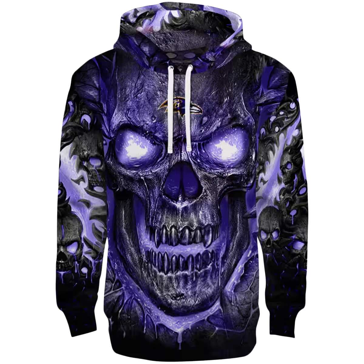 Unleash your spirit with the Baltimore Ravens Demonic Skull Purple Black All-Over Print Hoodie, designed for true fans who want to showcase their team pride in a bold, eye-catching way. Perfect for casual outings, game days, or simply lounging around, this hoodie combines a unique graphic design with comfort, making it an essential addition to your wardrobe.