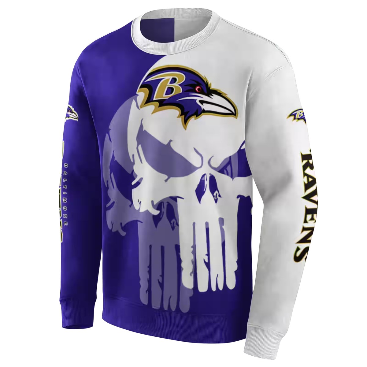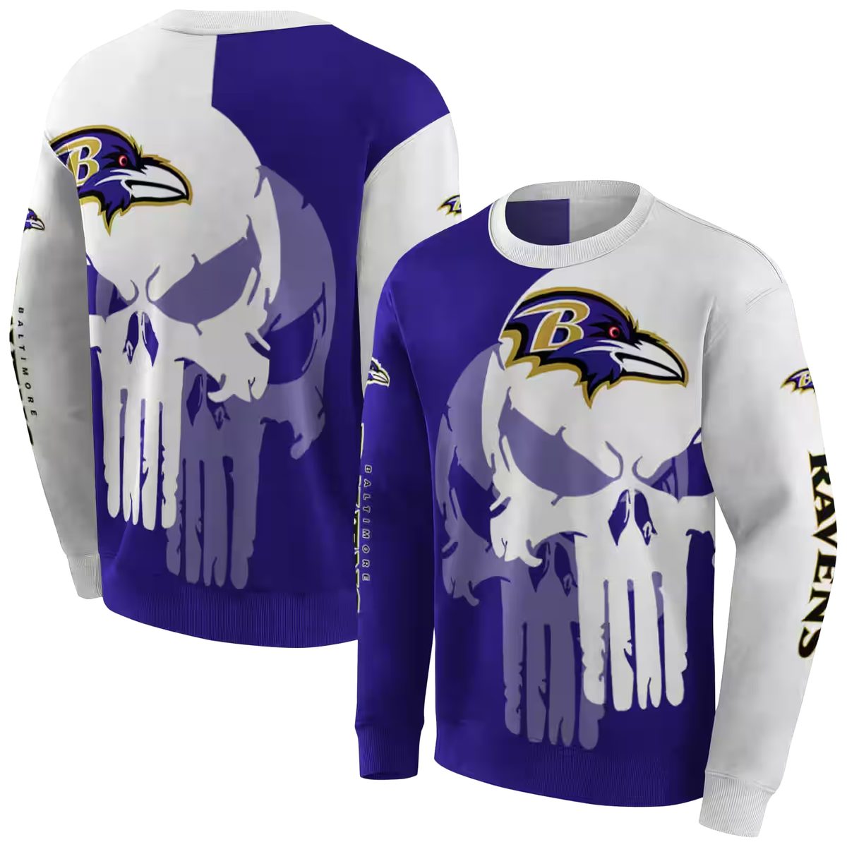 Show your team spirit with the Baltimore Ravens Graphic Punisher Skull AOP Sweatshirt. Designed for die-hard fans, this sweatshirt is the perfect addition to your streetwear wardrobe. Whether you’re heading to the game, lounging at home, or hitting the gym, its eye-catching design and relaxed fit make it a versatile choice for any casual occasion.