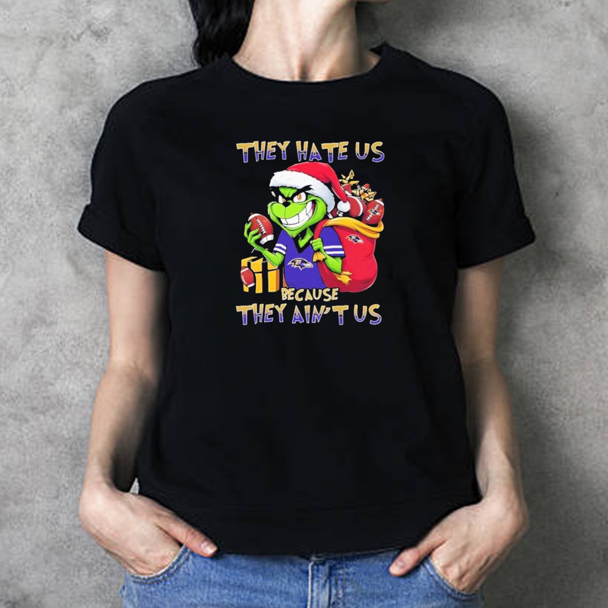 Get ready to show off your Baltimore Ravens spirit this holiday season with our fan-made “They Hate Us Because They Ain’t Us” Grinch T-shirt! Perfect for die-hard Ravens fans and anyone looking to add some festive flair to their wardrobe, this shirt is ideal for casual outings, themed events, or just lounging around the house. With its unique design printed in the USA, you’ll stand out in a crowd while celebrating your love for the game and the holiday spirit.