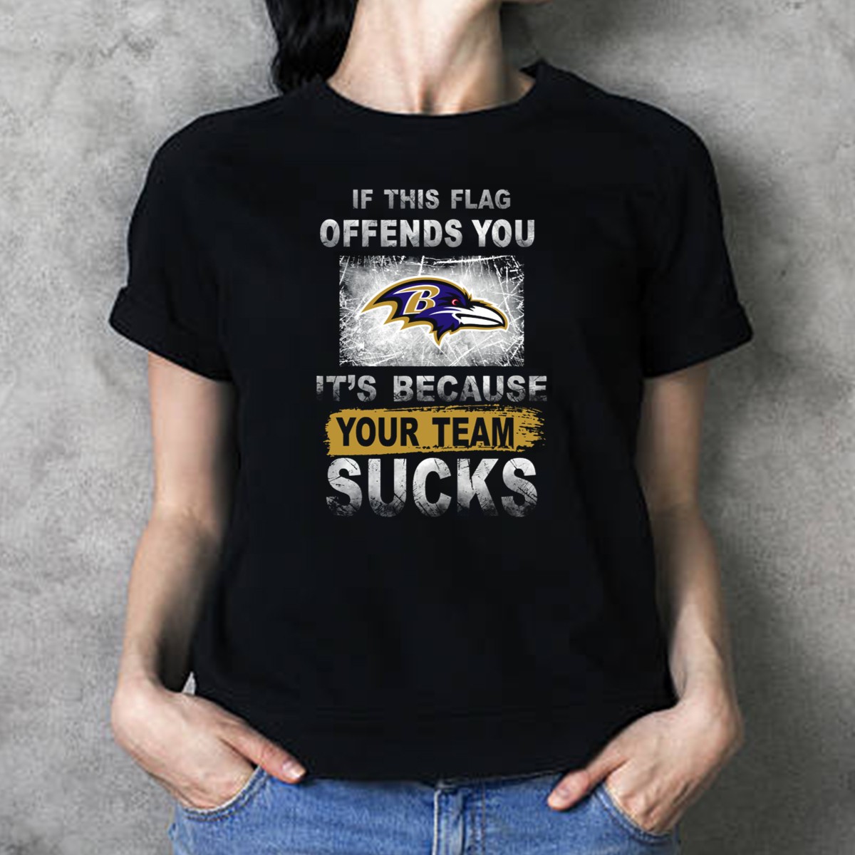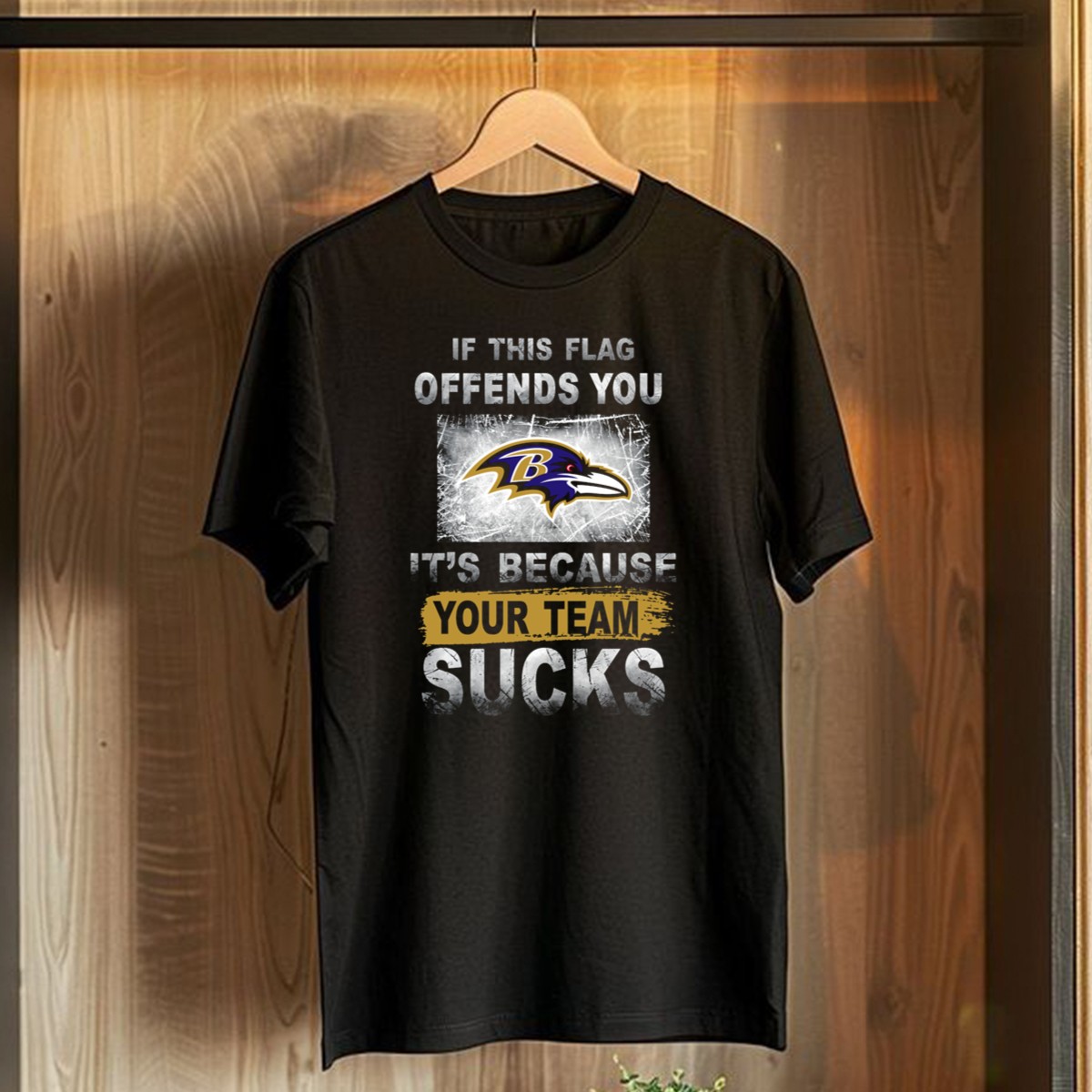 Show off your team spirit with our “If This Flag Offends You Its Because Your Team Sucks” T-shirt, specifically designed for passionate Baltimore Ravens fans. This shirt is perfect for casual outings, themed events, or daily wear, allowing you to make a bold statement wherever you go. Crafted with a fan-made design and printed in the USA, this shirt not only showcases your love for the Ravens but also stands out with its unique message that’s sure to spark conversations.
