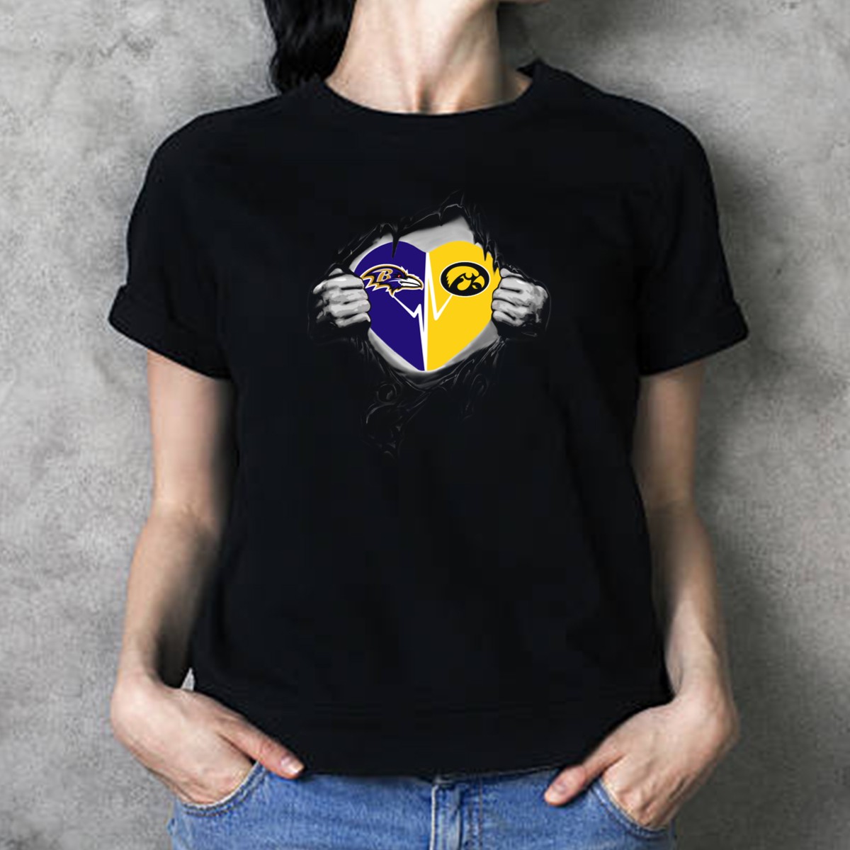 Show your love for both the Baltimore Ravens and the Iowa Hawkeyes with this unique fan-made graphic T-shirt! Perfect for dedicated sports fans, this shirt celebrates the spirit of competition and camaraderie. Whether you’re cheering from the stands, hosting a game day party, or just lounging at home, this classic tee is designed for comfort and style, making it an ideal choice for any casual occasion.