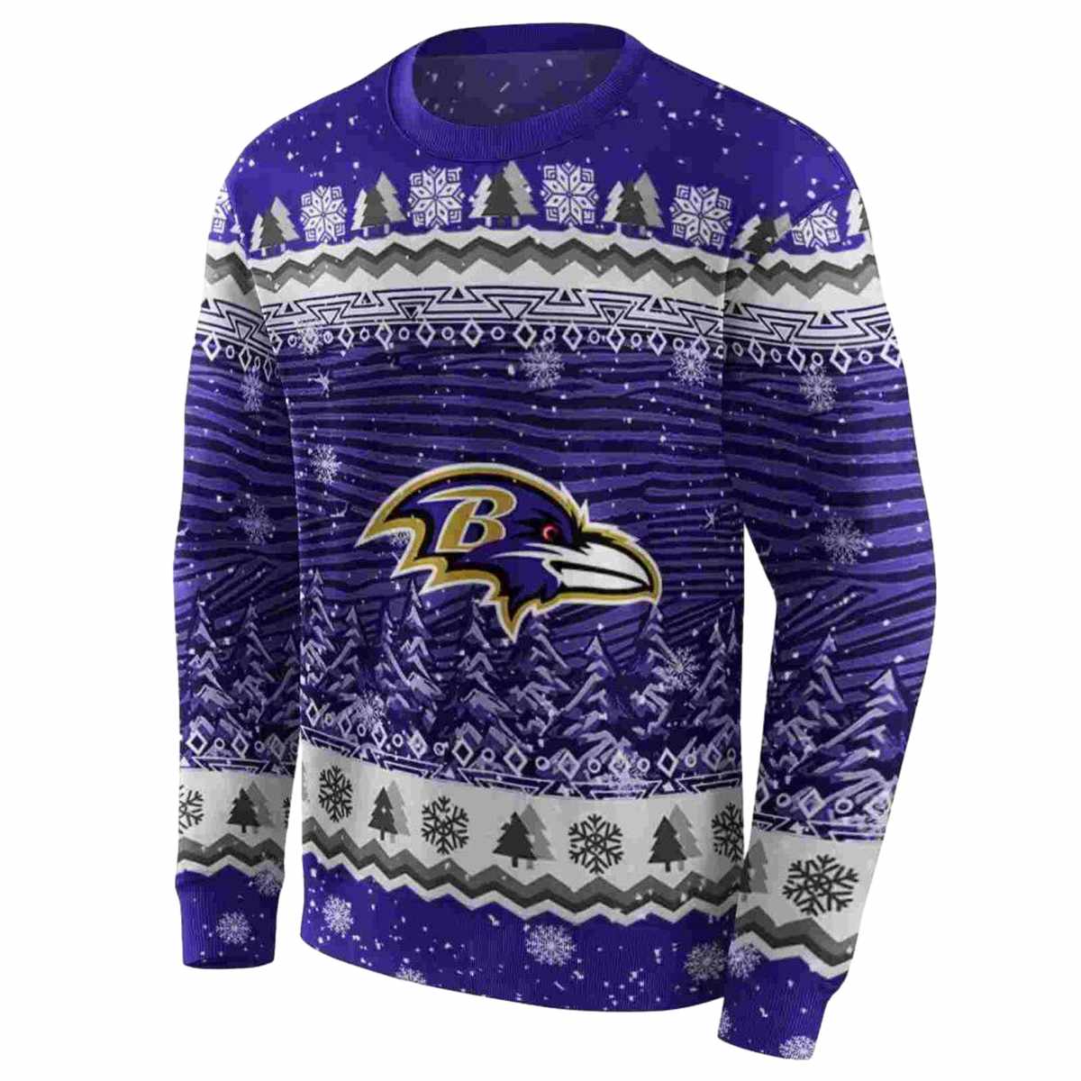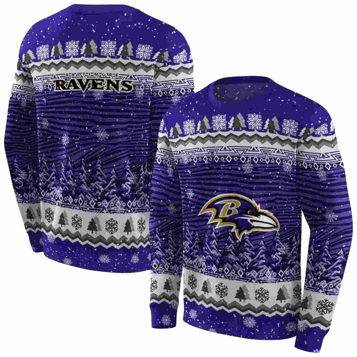 Get into the festive spirit with our Baltimore Ravens Logo Christmas Trees Purple AOP Sweatshirt, designed for fans who love to showcase their team pride while celebrating the holiday season. This cozy sweatshirt is perfect for game days, holiday parties, or simply lounging at home. With its eye-catching design and relaxed fit, it offers a unique blend of sporty style and seasonal cheer.