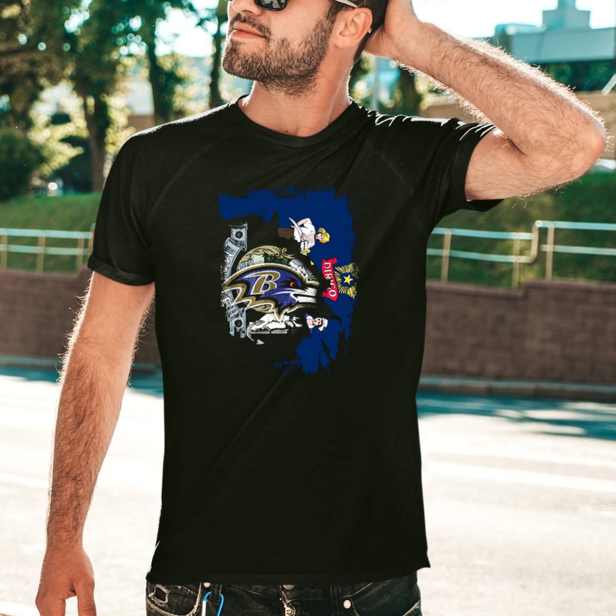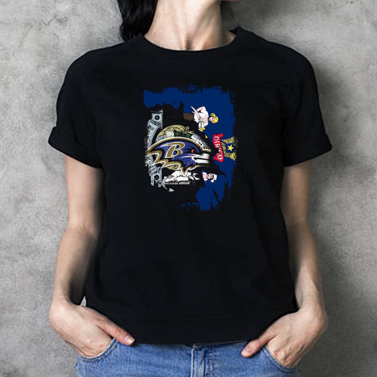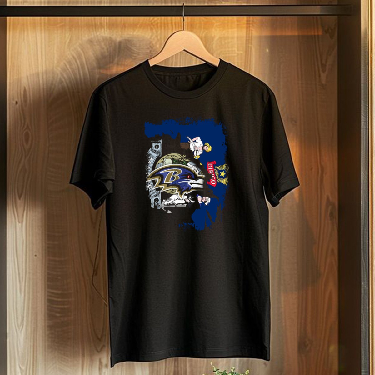 Show your pride for the Baltimore Ravens with this unique T-shirt that features the iconic team’s logo blended with the elements of the Maine state flag. Perfect for passionate fans, this shirt is designed for casual outings, game days, or themed events, making it a versatile addition to your wardrobe. Made in the USA, this fan-made design not only showcases your team spirit but also celebrates the beauty of Maine, making it a standout piece for any die-hard supporter.