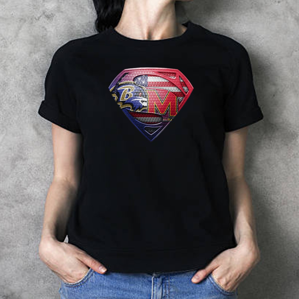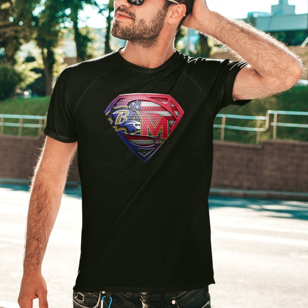 Show off your team spirit with this Baltimore Ravens Maryland Terrapins Superman Logo American Flag T-Shirt! Perfect for die-hard fans and casual wearers alike, this shirt combines a bold design that pays homage to your favorite teams with a patriotic twist. Ideal for game days, themed events, or just hanging out with friends, this fan-made tee is a unique addition to any wardrobe, proudly printed in the USA.