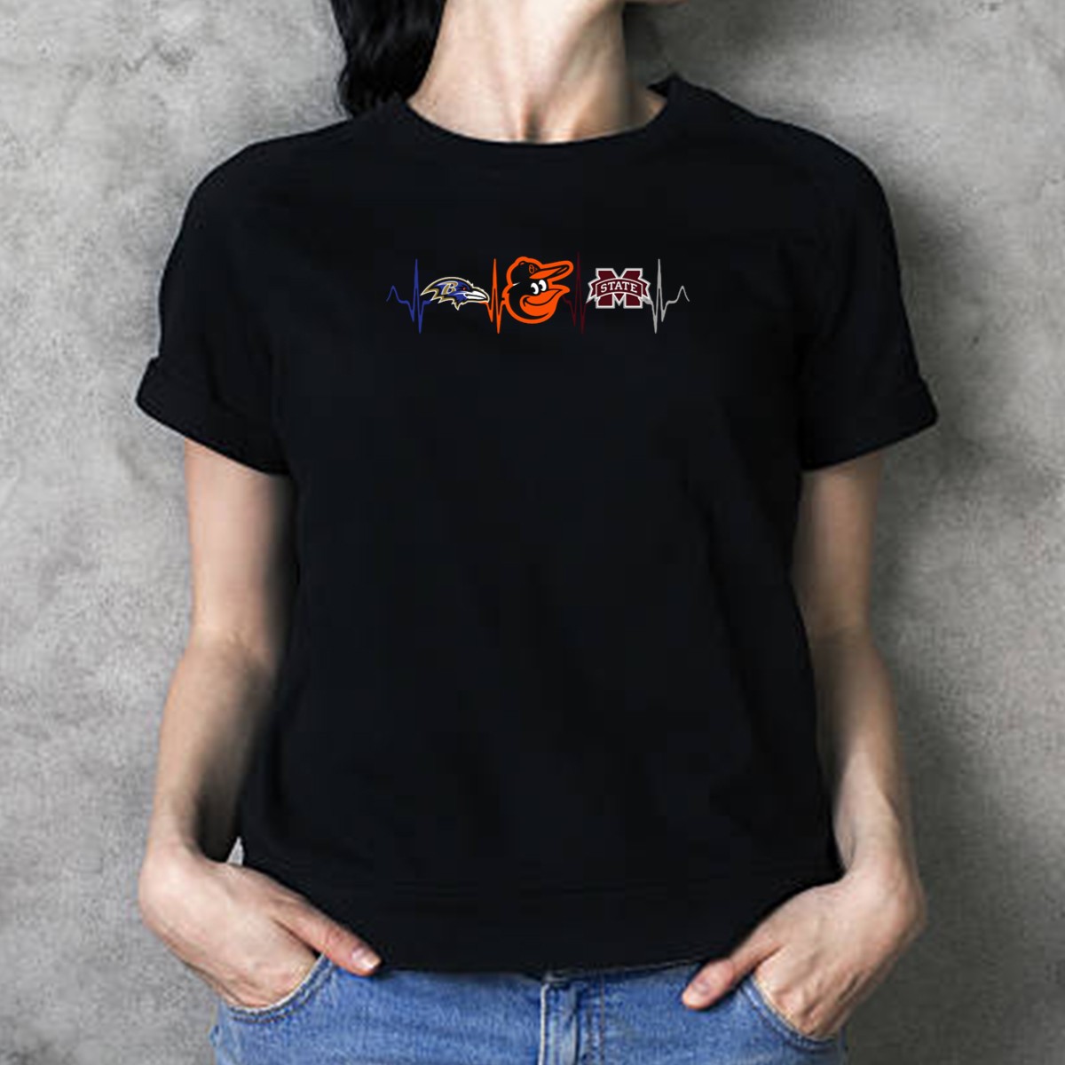Show your love for the Baltimore Ravens, Orioles, and Mississippi State with this heart-pounding graphic T-shirt! Perfect for fans who want to sport their team pride in style, this shirt is great for casual outings, themed events, or simply enjoying the game at home. The eye-catching design is fan-made and proudly printed in the USA, making it a unique addition to your wardrobe that showcases your loyalty and passion.