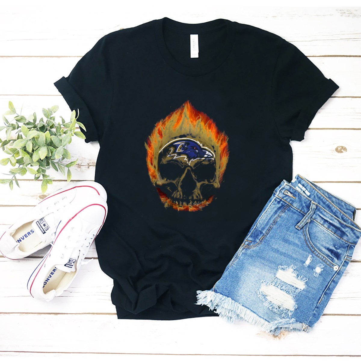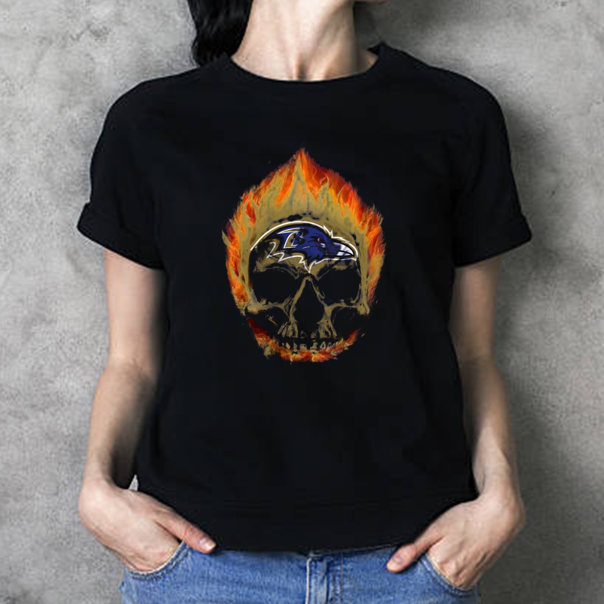 Show your unwavering support for the Baltimore Ravens with this eye-catching Skull Flaming Logo Fire T-Shirt. Perfect for die-hard fans and casual wearers alike, this shirt showcases a bold design that captures the fierce spirit of the team. Whether you’re cheering from the stands, attending a themed event, or just enjoying a laid-back day, this T-shirt will make a statement wherever you go. Crafted for comfort and style, it’s a must-have addition to any Ravens fan’s wardrobe.