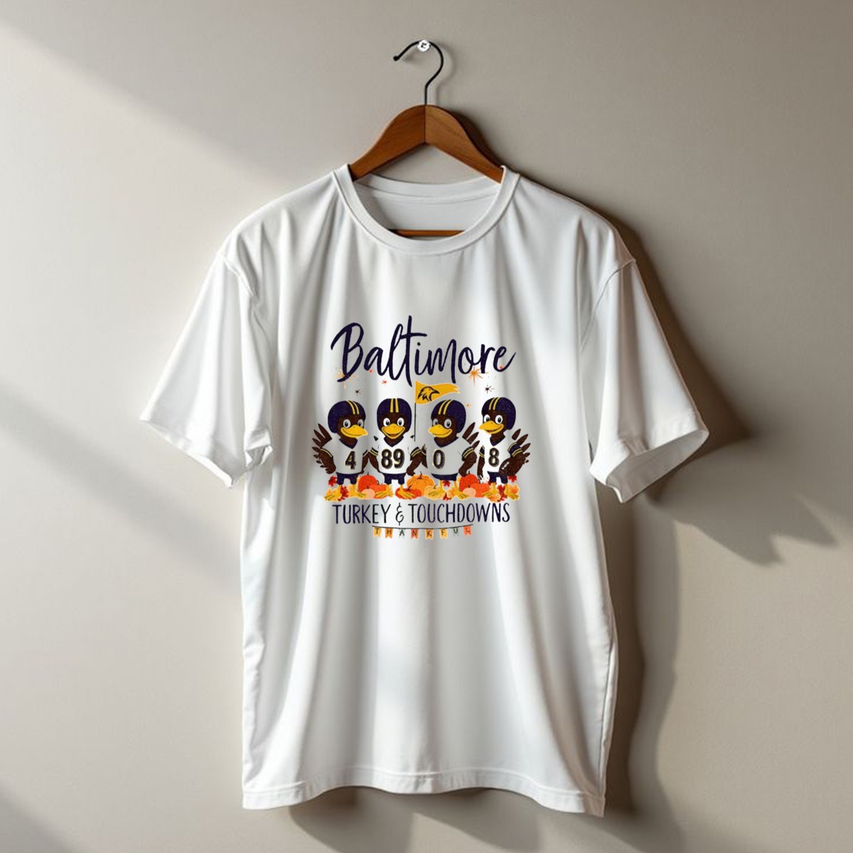Get ready to celebrate Thanksgiving in style with our Baltimore Ravens Turkey and Touchdowns T-shirt! This fan-made design is perfect for die-hard Ravens supporters who want to show their team spirit while enjoying the festivities of the season. Whether you’re at a family gathering, a themed football party, or just lounging at home, this unique shirt combines your love for the game with a festive twist, making it an ideal choice for all-season casual wear.