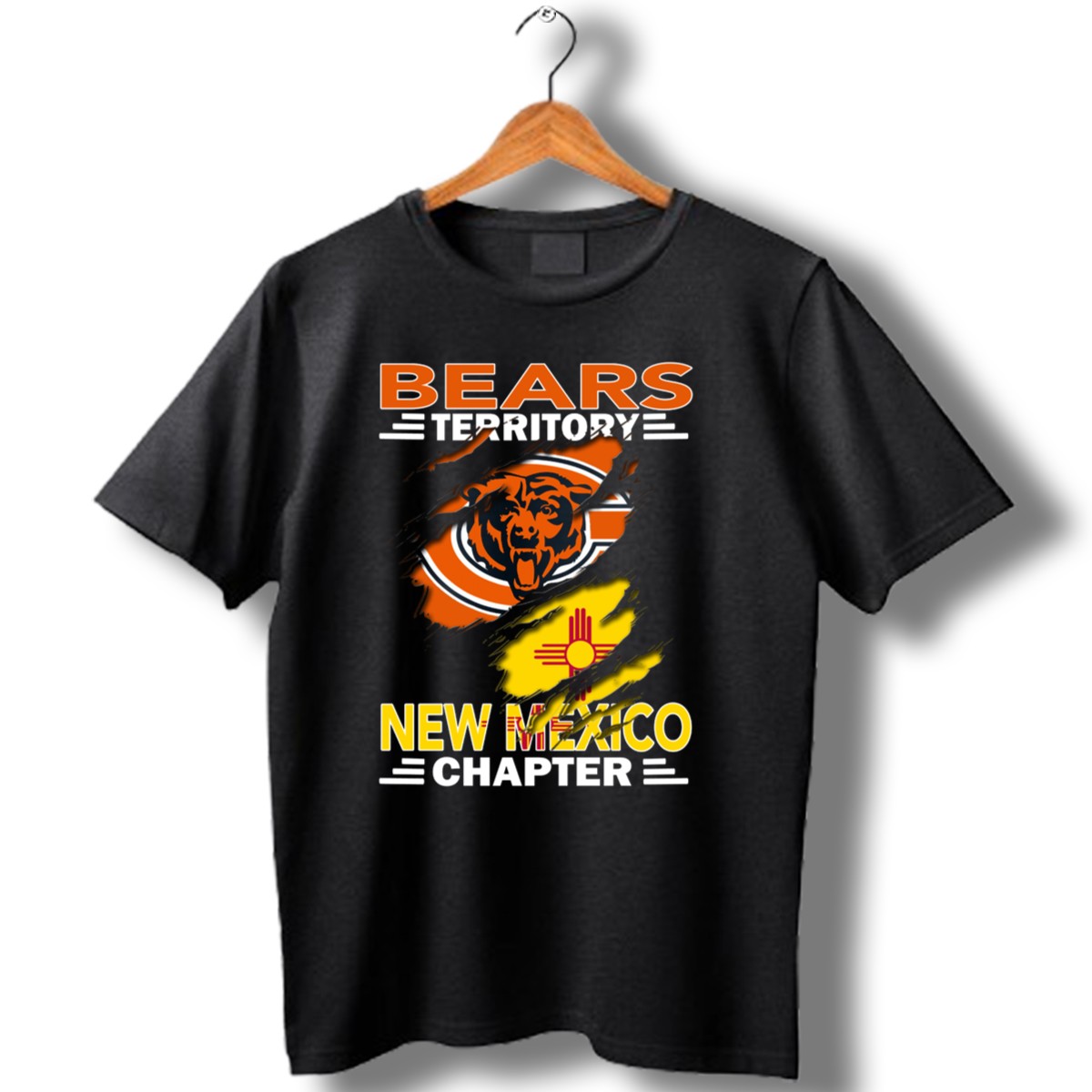 Show your pride for the Chicago Bears with our Bears Territory New Mexico Chapter T-shirt! This fan-made design features a unique Zia symbol intertwined with the iconic Bears logo, making it the perfect choice for die-hard fans. Whether you’re heading to a game, a themed event, or just enjoying a casual day out, this shirt combines comfort and style effortlessly. Proudly printed in the USA, it’s a must-have for any Bears enthusiast looking to stand out.