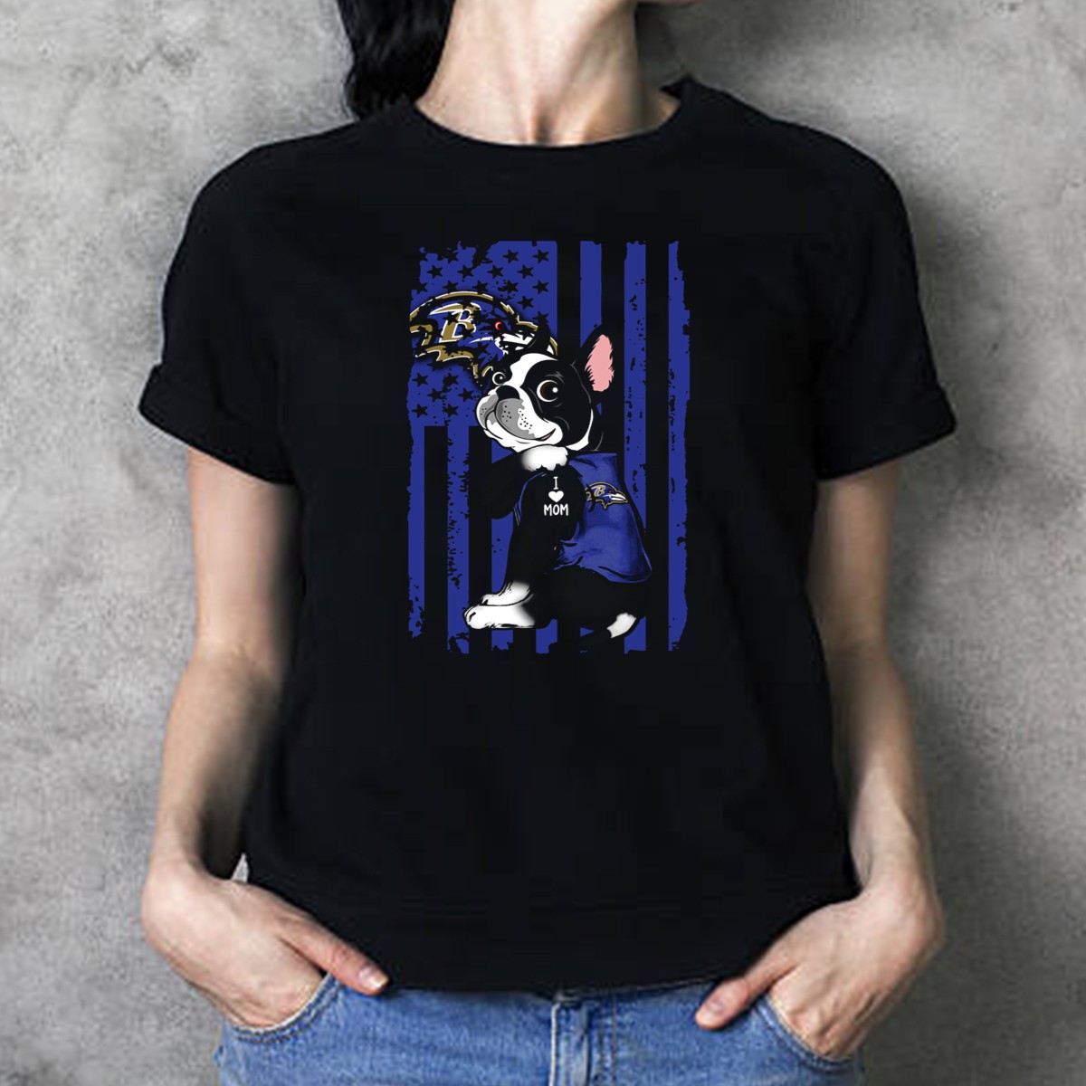 Show off your love for your furry friend and your favorite football team with our Boston Terrier I Love Mom Baltimore Ravens NFL Fan T-Shirt! This unique graphic tee is perfect for dog lovers and Ravens fans alike, making it an ideal choice for casual outings, themed events, or just lounging at home. With its eye-catching design featuring the American flag, this shirt will keep you stylish and comfortable during any season.
