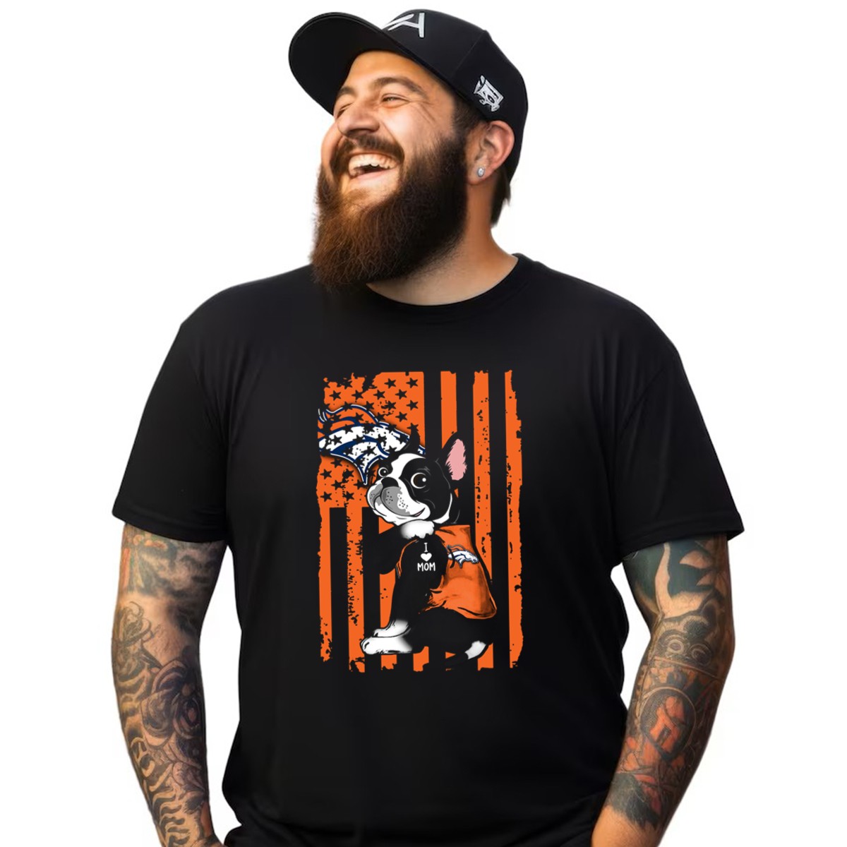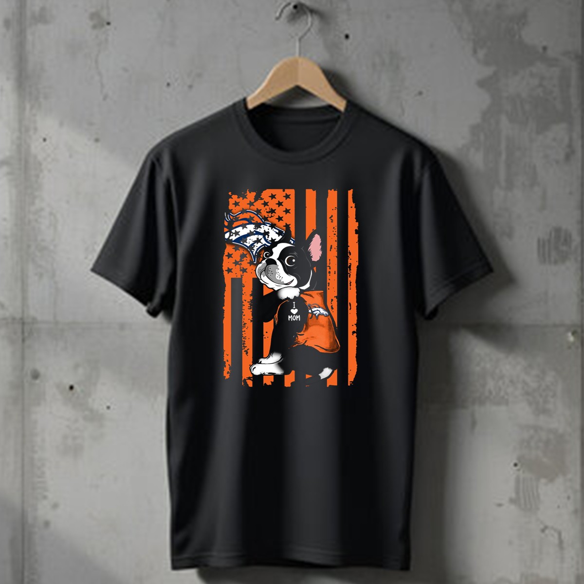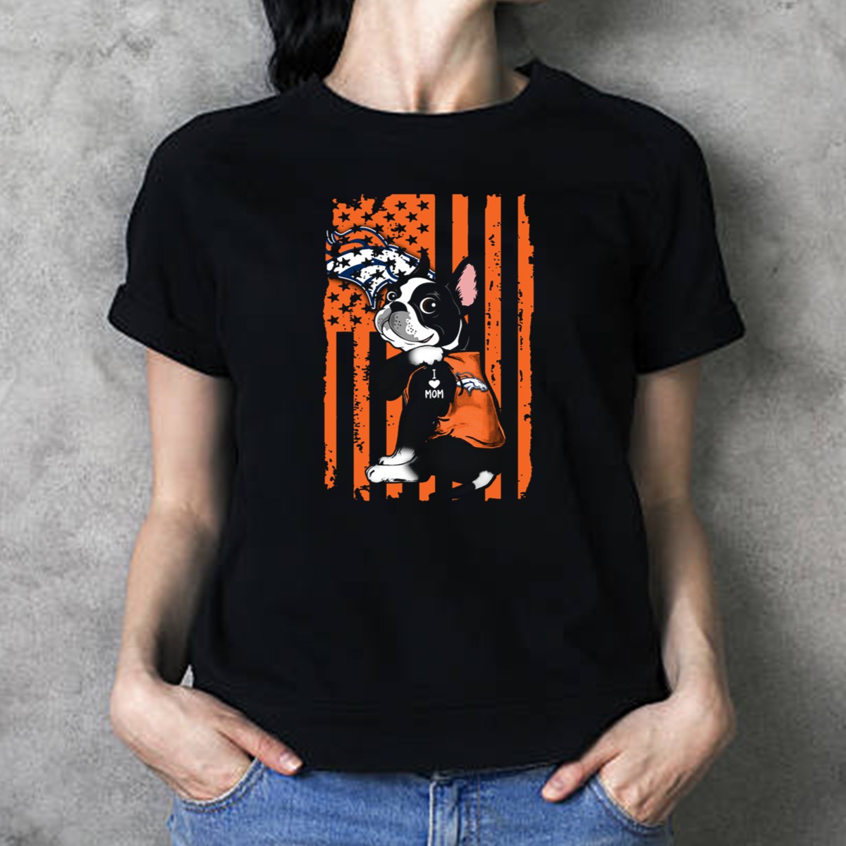 Celebrate your love for both your furry friend and your favorite football team with our Boston Terrier I Love Mom Denver Broncos American Flag Stars T-Shirt. Perfect for dog lovers and sports enthusiasts alike, this fan-made design is ideal for casual outings, themed events, or everyday wear. With its eye-catching graphics and patriotic flair, this shirt is a must-have for any proud Denver Broncos supporter who wants to showcase their passion in style.