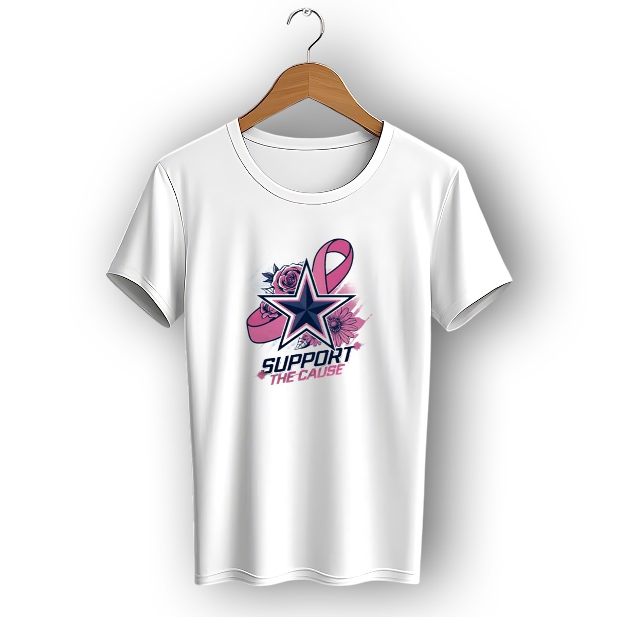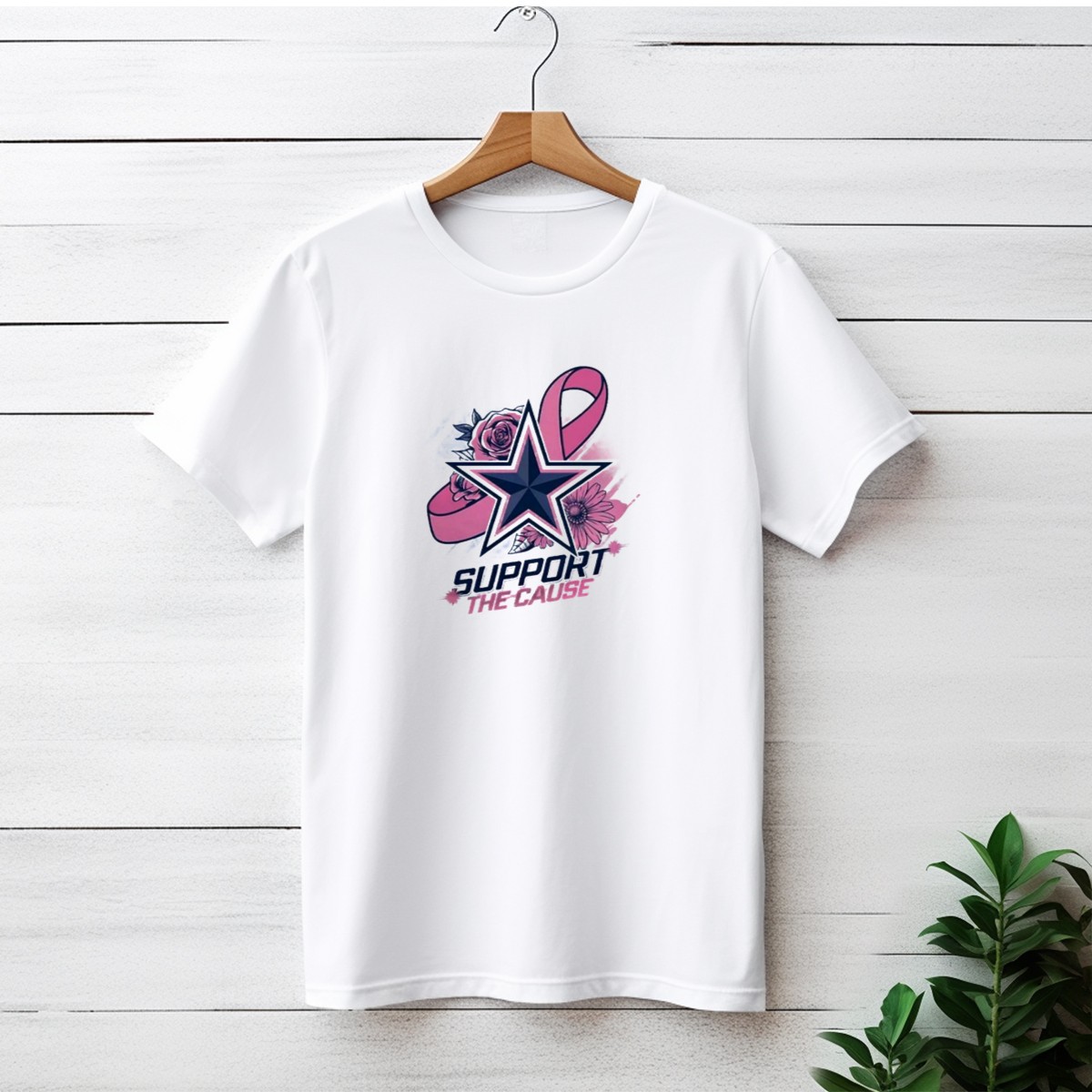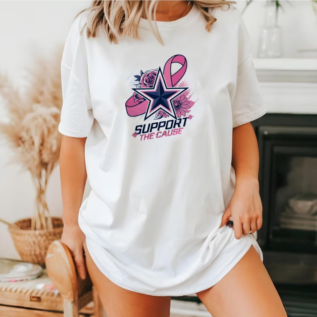 Show your support for breast cancer awareness with this unique Dallas Cowboys-themed T-shirt. Perfect for fans who want to combine their love for the game with a meaningful cause, this shirt is ideal for casual outings, themed events, or simply making a statement in your daily wear. Made with care in the USA, this fan-made design not only looks great but also promotes a vital message of hope and solidarity.