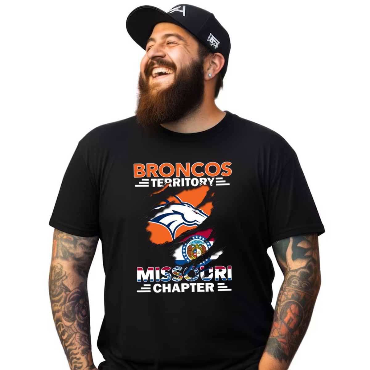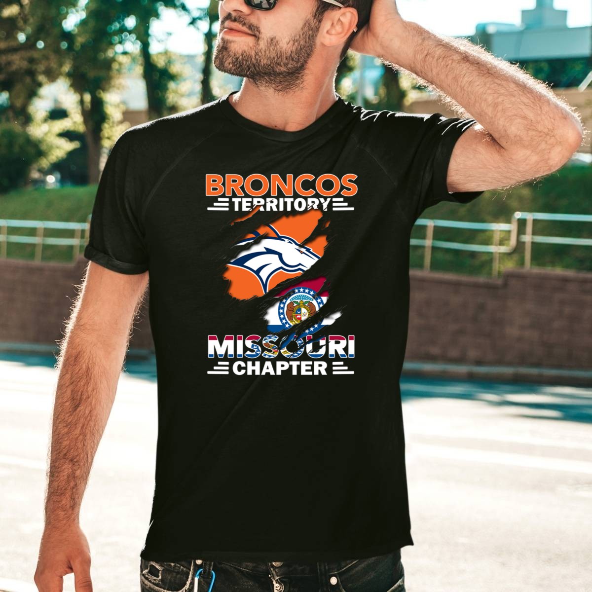 Show off your pride for the Denver Broncos and the Show-Me State with our Broncos Territory Missouri Chapter T-Shirt. This fan-made design beautifully combines the iconic Broncos logo with the Missouri state flag, making it perfect for die-hard fans and proud Missourians alike. Whether you’re cheering from the stands, enjoying a themed event, or just hanging out with friends, this shirt is a versatile addition to any casual wardrobe.