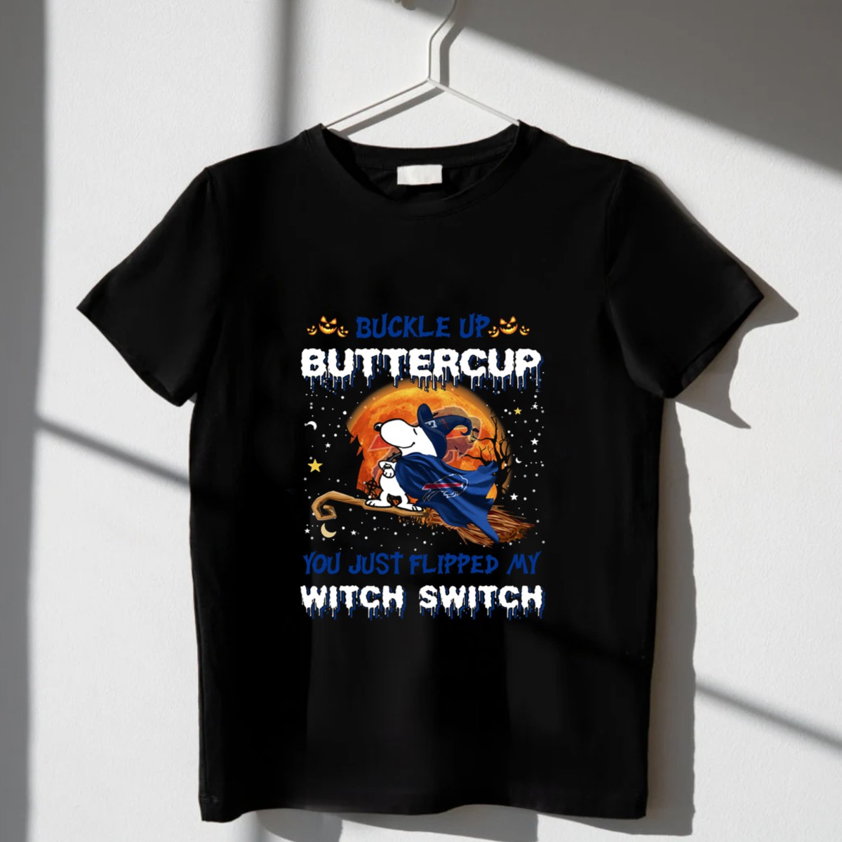 Get ready to embrace the Halloween spirit with our fan-made “Buckle Up Buttercup You Just Flipped My Witch Switch” T-shirt featuring your favorite Snoopy character. Perfect for Buffalo Bills fans who love to combine their passion for football with a touch of spooky fun, this shirt is ideal for casual outings, themed events, or just lounging at home. Made with high-quality materials and printed in the USA, it’s designed to keep you comfortable and stylish all season long.