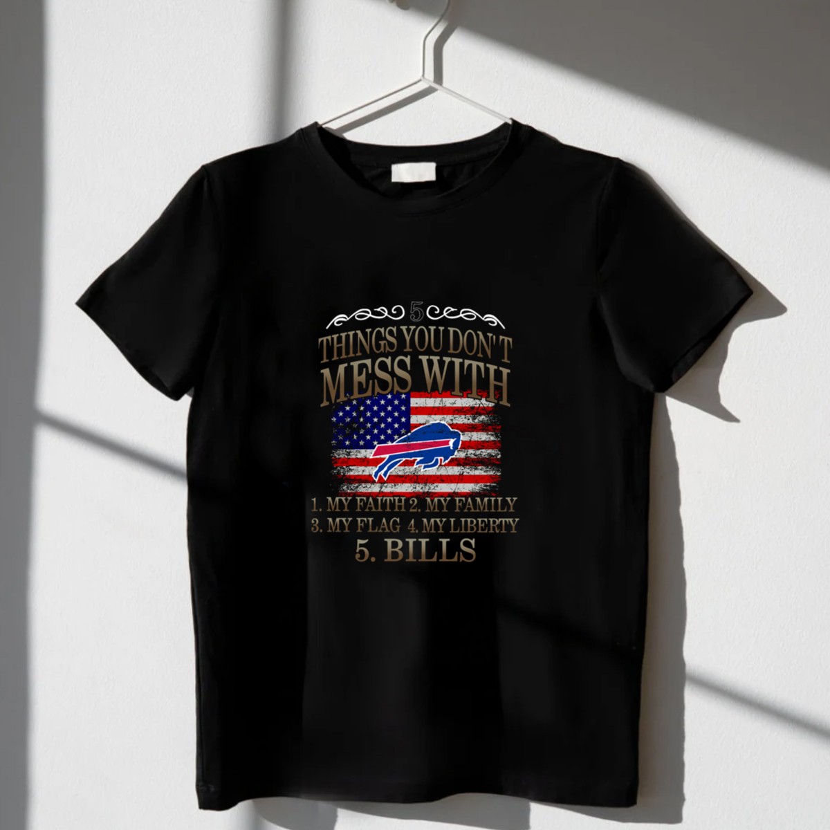 Show your unwavering support for the Buffalo Bills with our “5 Things You Don’t Mess With – My Faith, Family, Flag, Liberty” T-shirt! This fan-made design is perfect for die-hard Bills fans who want to make a statement while enjoying comfort and style. Ideal for casual outings, themed events, or daily wear, this shirt adds a touch of team pride to any occasion. Made and printed in the USA, it showcases your loyalty to the team and the values you hold dear.
