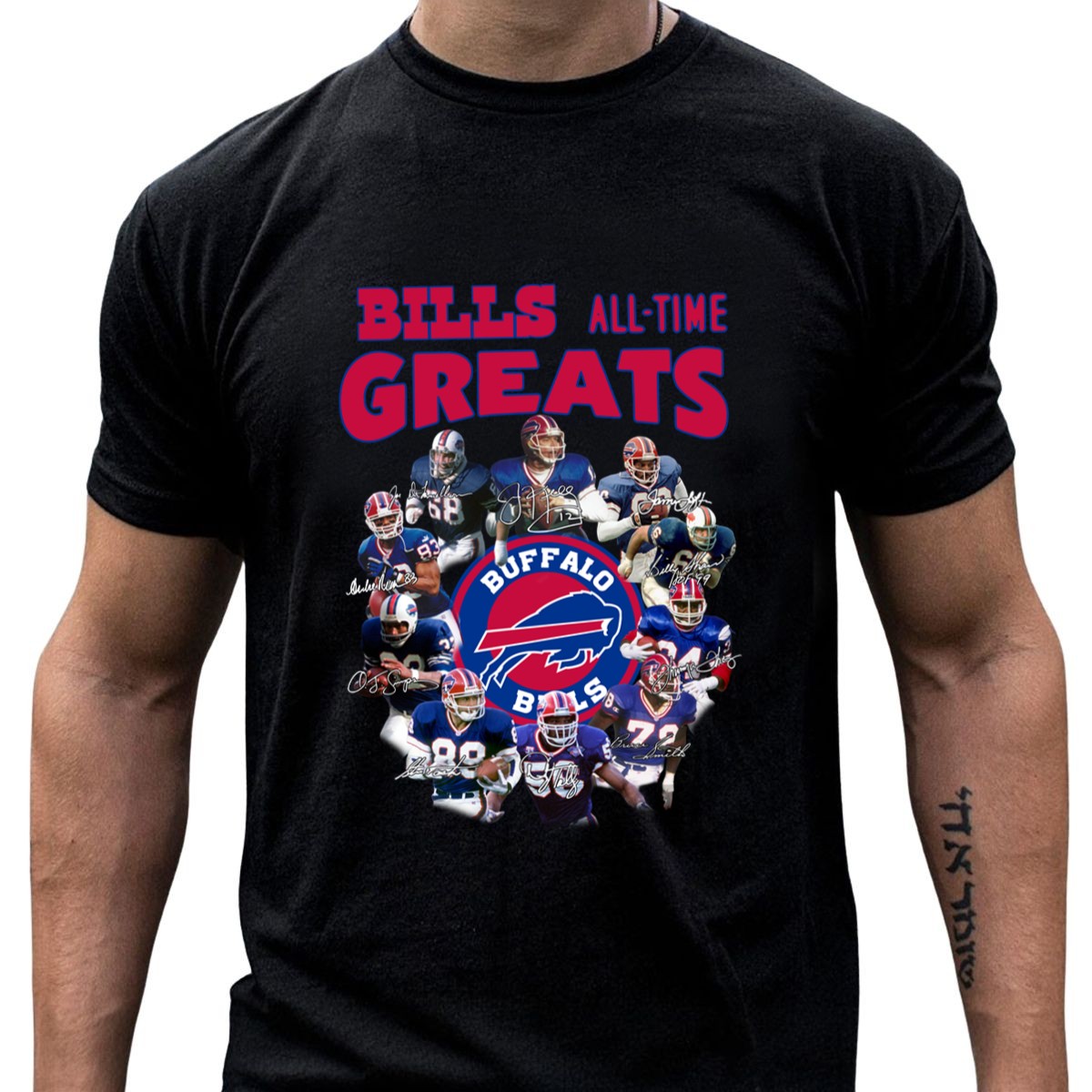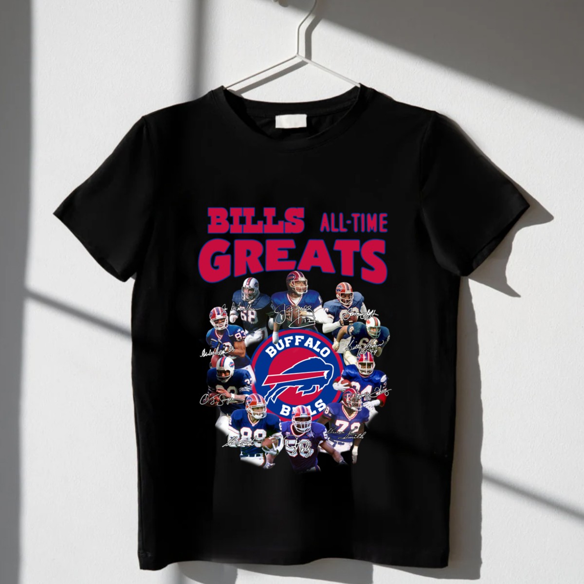 Show your unwavering support for the Buffalo Bills with our exclusive all team greats signature T-shirt! This fan-made design celebrates the legendary players who have donned the Bills jersey, making it a perfect choice for die-hard fans. Whether you’re heading to a game, a themed event, or just enjoying a casual day out, this shirt combines style and comfort, allowing you to wear your team pride wherever you go. Printed in the USA, it’s not just apparel; it’s a badge of honor for any Bills enthusiast!