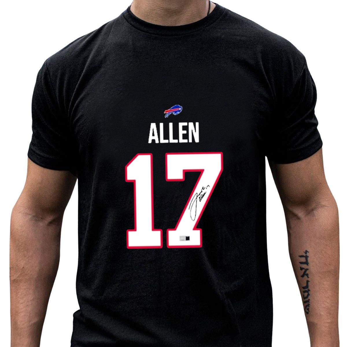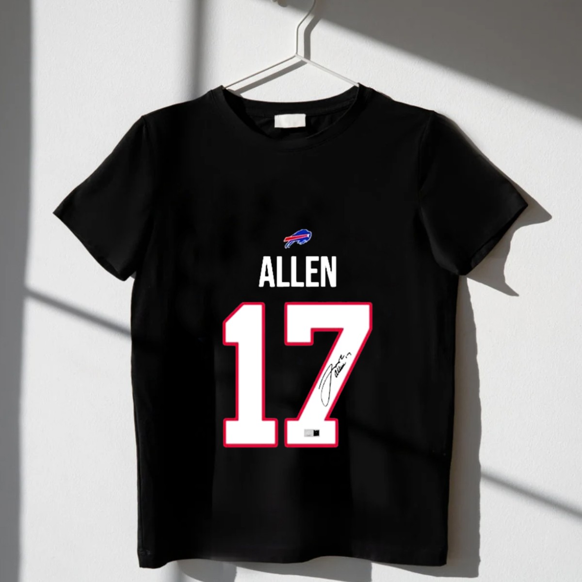 Show your unwavering support for the Buffalo Bills with our Allen 17 Signature Jersey T-Shirt. This fan-made design is perfect for die-hard fans who want to showcase their team spirit at casual gatherings, themed events, or during everyday outings. Crafted with high-quality materials and printed in the USA, this shirt combines comfort and style, making it a unique addition to your wardrobe.