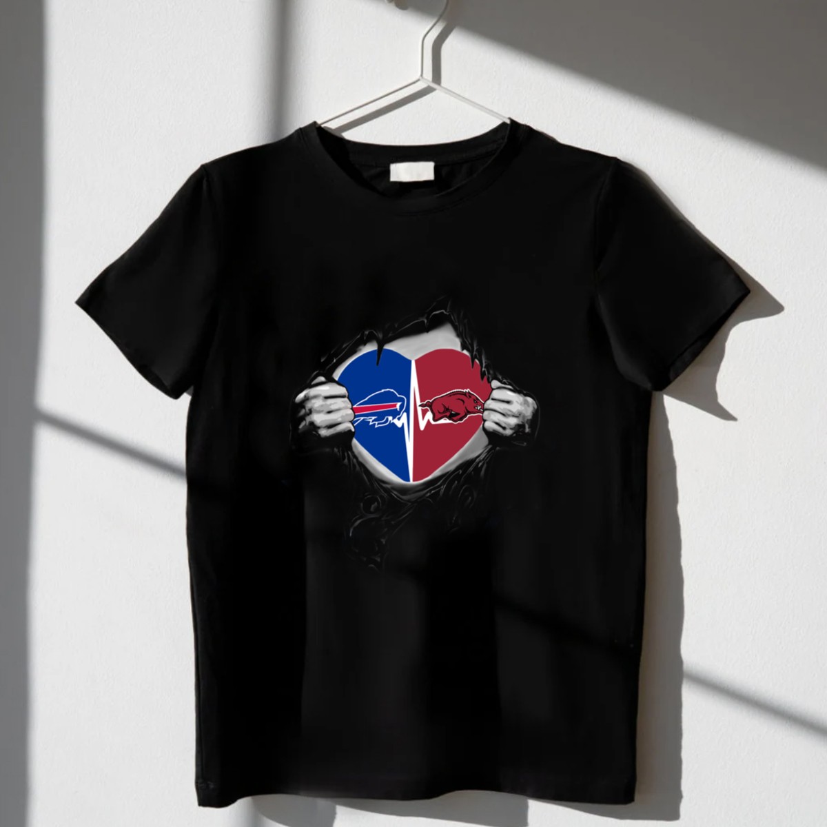Show off your team spirit with the Buffalo Bills Arkansas Razorbacks Heartbeat Split Fan Passion T-Shirt! Perfect for die-hard fans who want to express their love for both teams, this shirt combines comfort and style for any casual occasion. Whether you’re at a game, a themed event, or just enjoying a relaxed day out, this unique fan-made design will make you stand out while keeping you cool and comfortable.