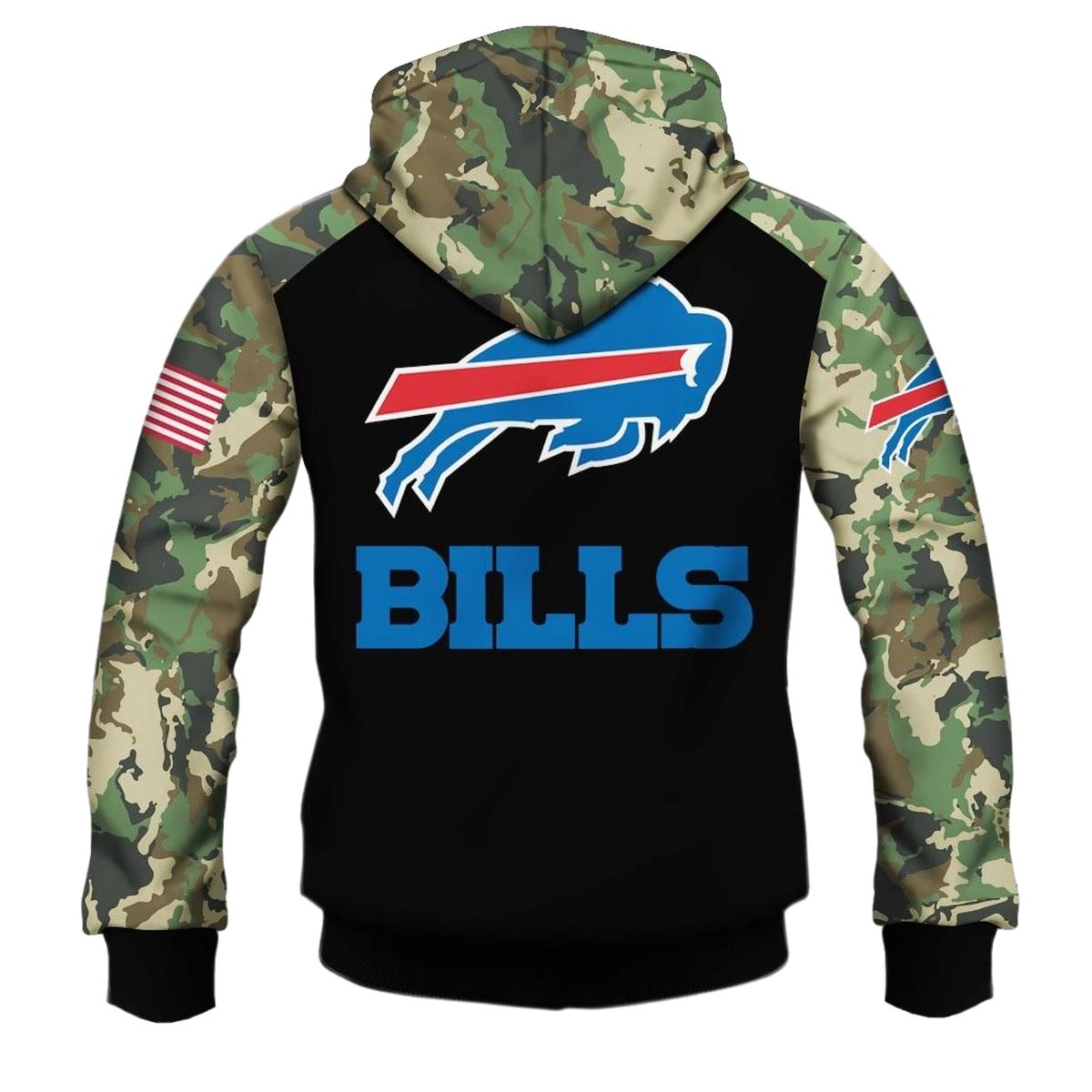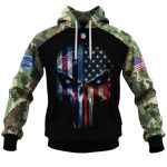 Introducing the ultimate statement piece for fans of style and sport: the Buffalo Bills Army Camouflage American Flag Punisher Skull AOP Hoodie. This hoodie is perfect for those who want to showcase their team spirit while enjoying the cozy comfort of a relaxed fit. Ideal for casual outings or outdoor activities during the winter months, this unique design combines a patriotic theme with a bold graphic, making it a must-have for any die-hard fan.