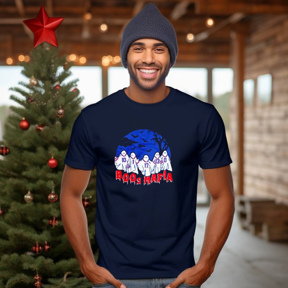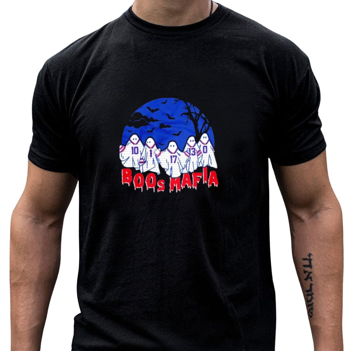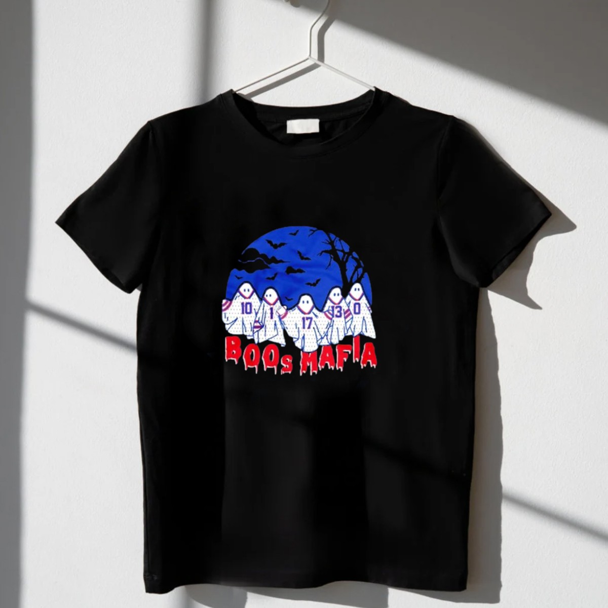 Celebrate your love for the Buffalo Bills this Halloween with our exclusive Boos Mafia graphic T-shirt! Perfect for die-hard fans, this shirt showcases a spooky yet playful design featuring ghostly players, bats, and eerie trees, making it an ideal choice for themed events or casual outings. Made from soft, durable cotton, this shirt ensures you stay comfortable while cheering on your team or enjoying Halloween festivities. Stand out in style and show off your fandom with this uniquely crafted tee, proudly printed in the USA.