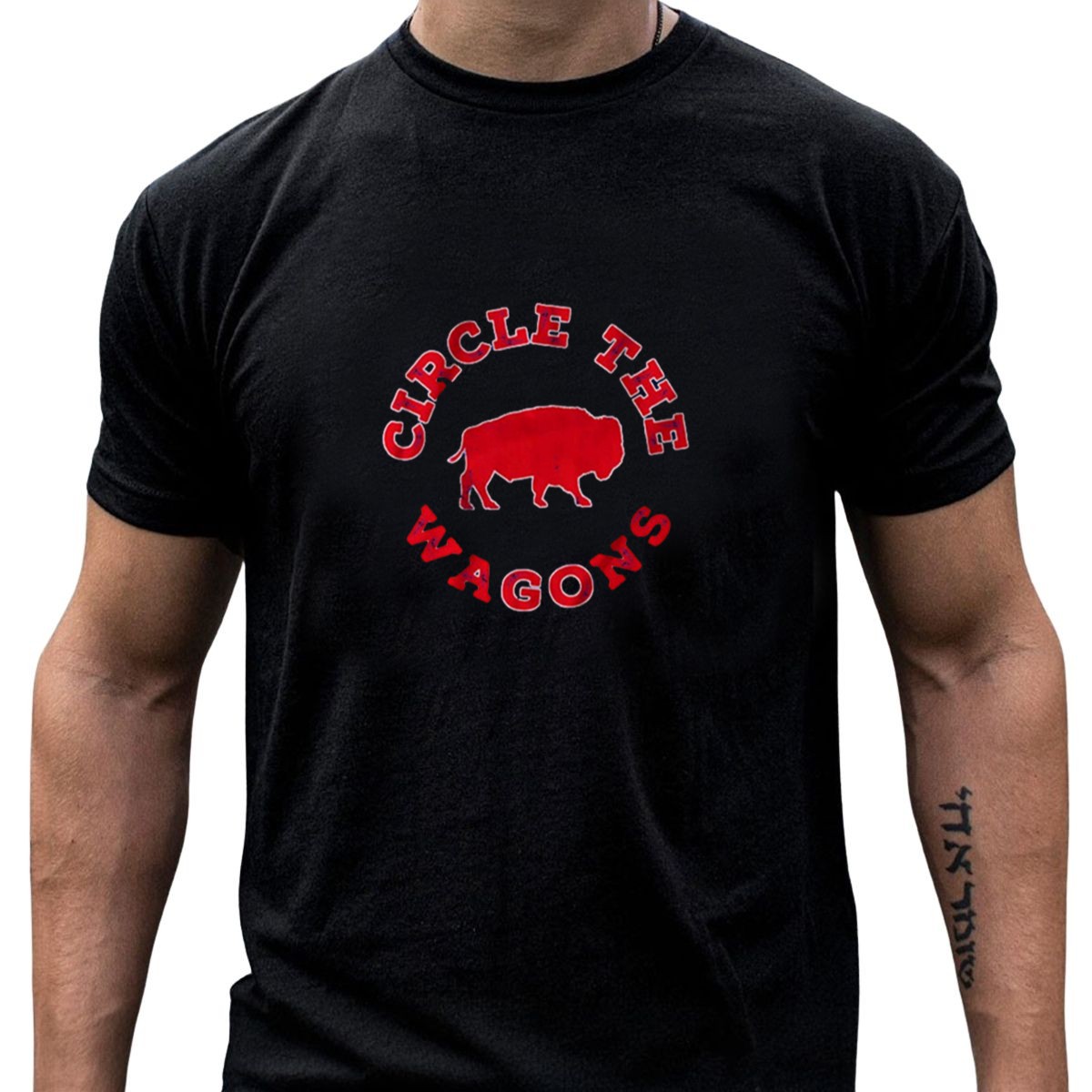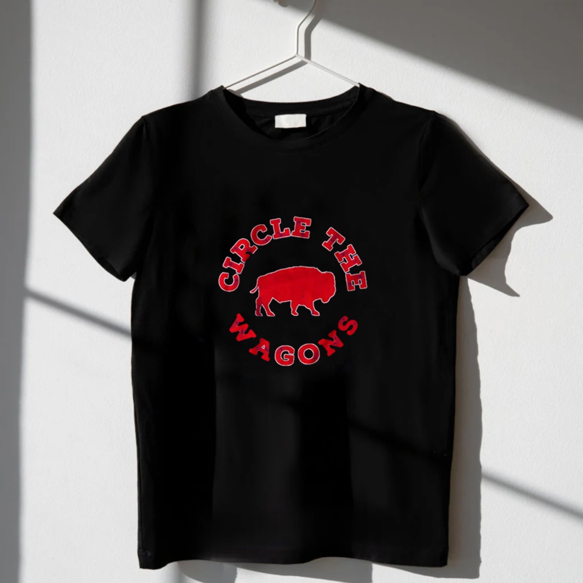 Show your team spirit with our Buffalo Bills Circle The Wagons Red Bison T-Shirt! Perfect for die-hard fans and casual wearers alike, this shirt captures the essence of Buffalo pride with its bold graphic design. Whether you’re cheering from the stands, attending a themed event, or just enjoying a laid-back day out, this shirt is a unique way to showcase your love for the Bills. Crafted from high-quality materials and printed in the USA, it’s a must-have addition to any fan’s wardrobe.