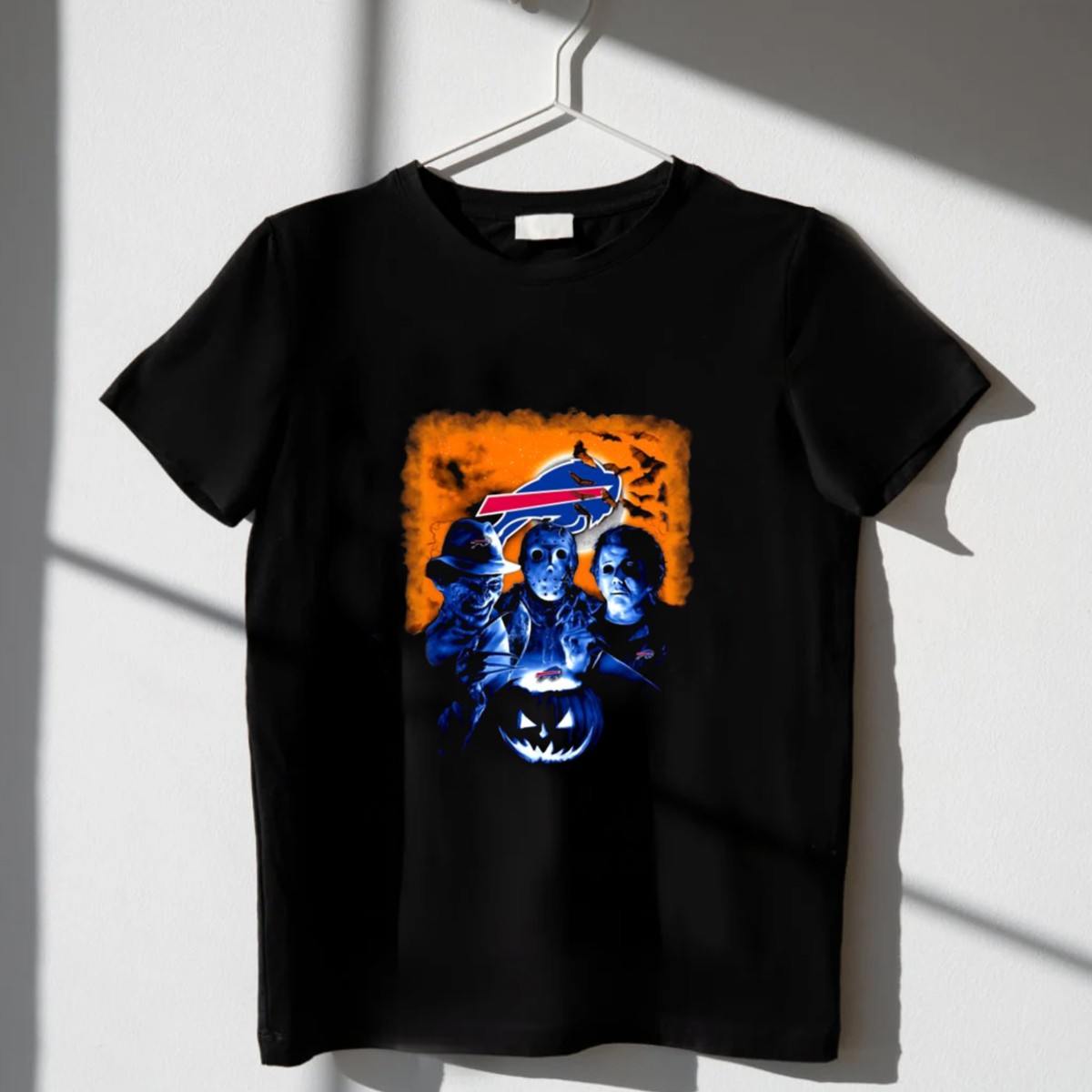 Get ready to support your favorite team while embracing the thrill of classic horror films with our Buffalo Bills Halloween Horror Movies T-Shirt. This fan-made design features iconic horror characters like Freddy Krueger, Jason Voorhees, and Michael Myers, perfect for die-hard Bills fans who love a good scare. Ideal for casual outings, themed events, or just chilling at home, this shirt combines comfort with a spooky twist that’s sure to grab attention!