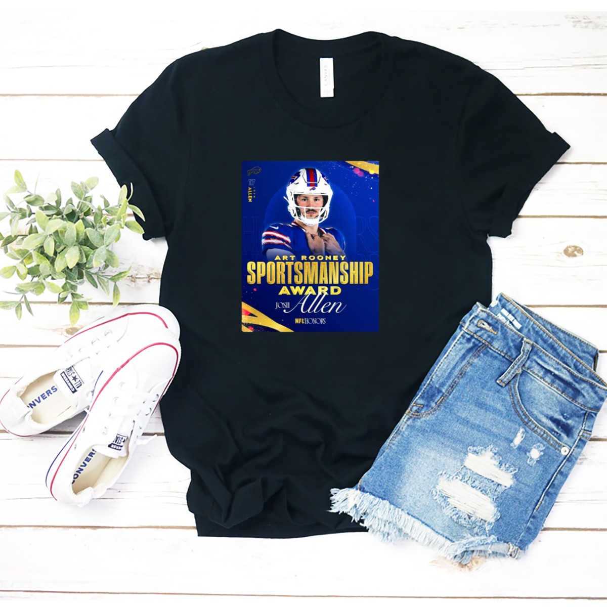 Show your support for the Buffalo Bills and celebrate the spirit of sportsmanship with the Josh Allen Art Rooney Sportsmanship Award T-shirt! This fan-made design is perfect for die-hard football enthusiasts and makes a fantastic addition to your game day attire or casual wardrobe. Crafted for comfort and style, this shirt embodies the camaraderie and respect that defines the NFL, making it an ideal choice for any themed event or daily wear.