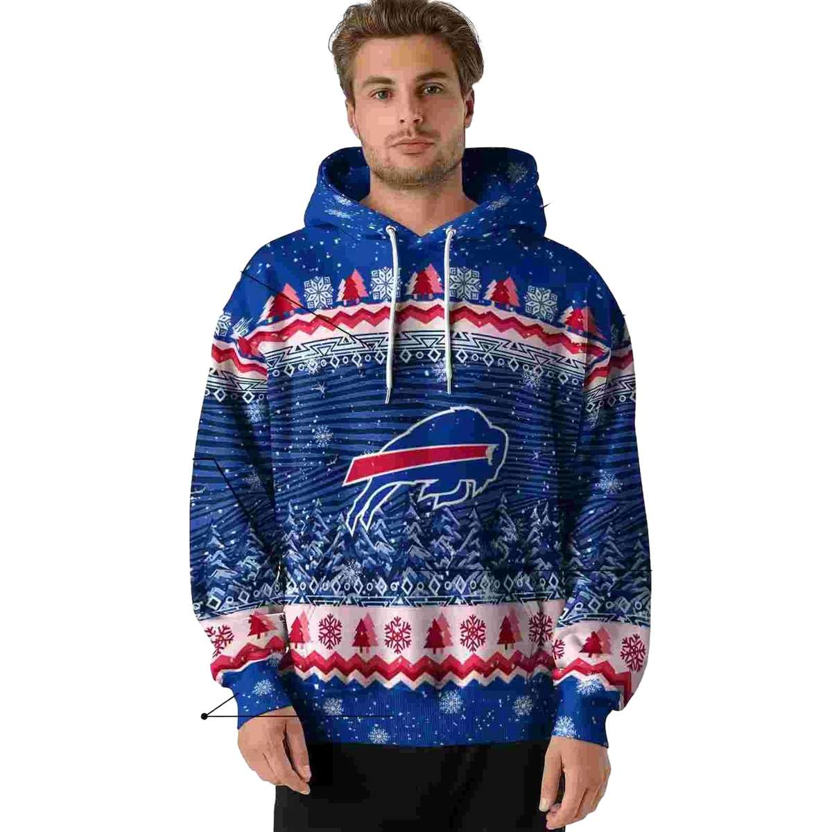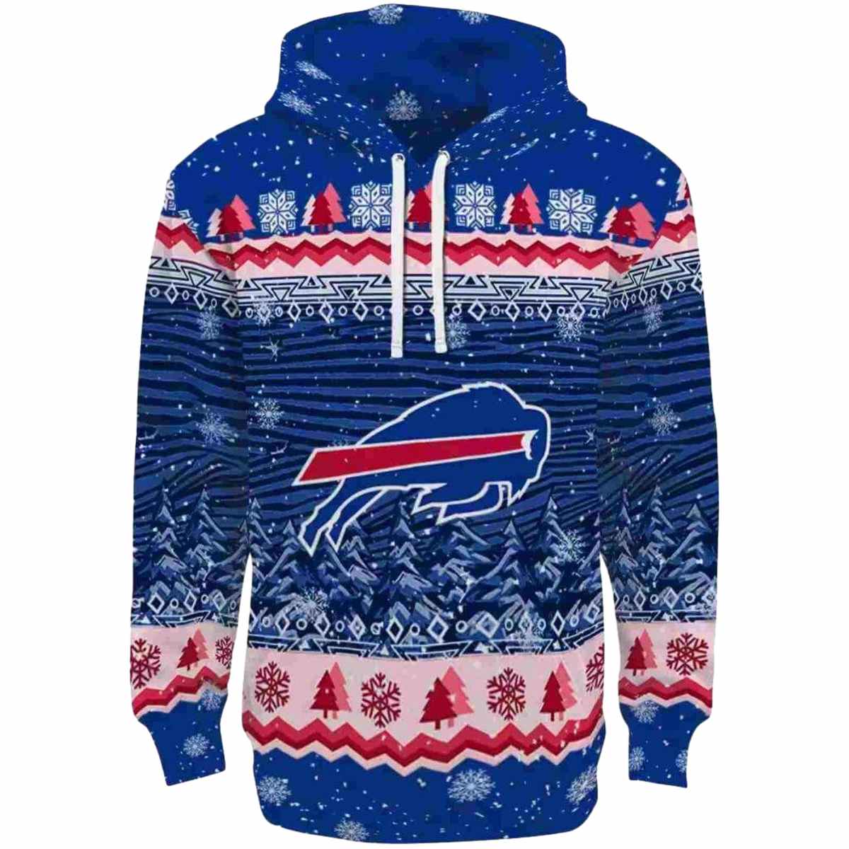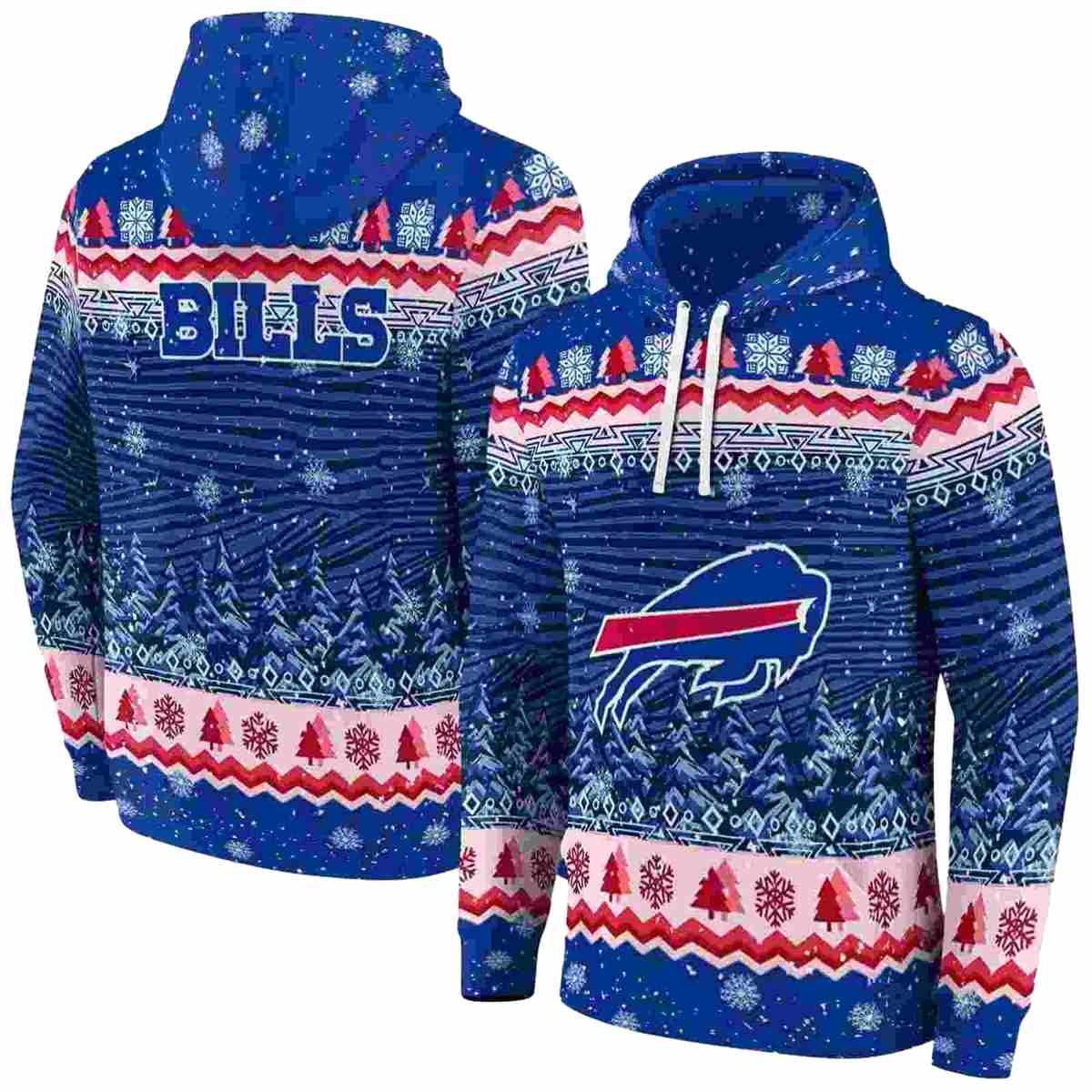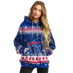 Celebrate your love for the Buffalo Bills while embracing the festive spirit with our Buffalo Bills Logo And Christmas Trees Blue All-Over Print Hoodie. This unique hoodie is perfect for any passionate Bills fan, offering a cozy yet stylish option for casual outdoor gatherings or cozy days at home during the winter season. Stand out with this eye-catching design that merges team pride with holiday cheer.