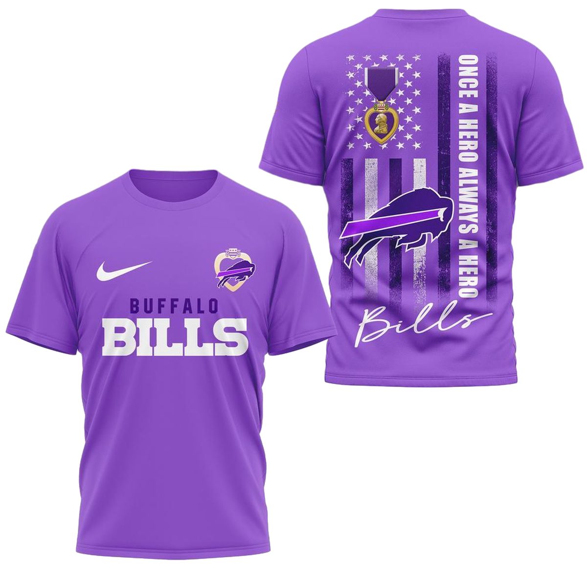 Show your support for the Buffalo Bills while honoring the spirit of Purple Heart Day with this eye-catching all-over printed T-shirt. Perfect for fans and anyone who appreciates a unique graphic tee, this shirt is ideal for casual outings, game day celebrations, or simply making a bold statement in your everyday style.