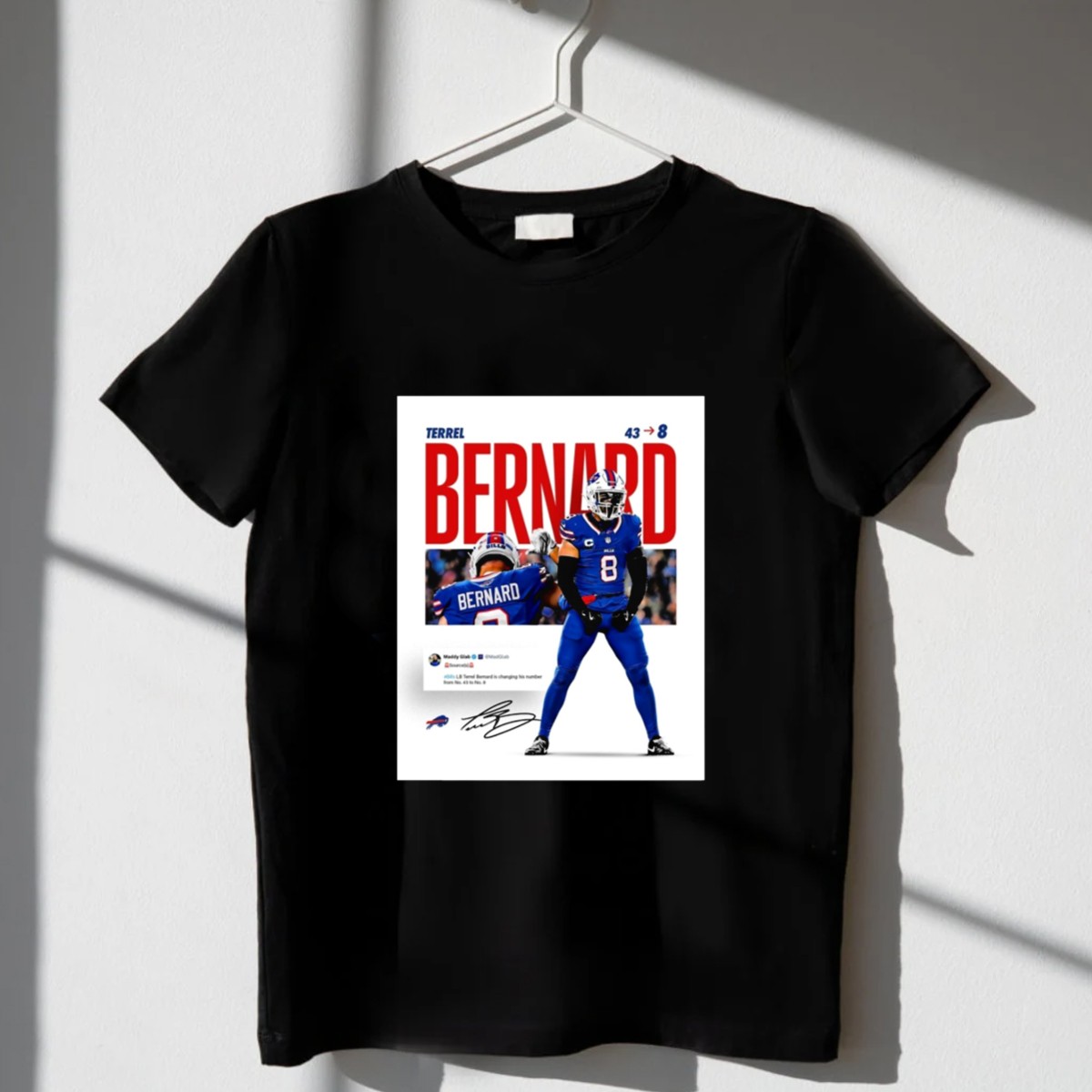 Show your unwavering support for the Buffalo Bills with this exclusive Terrel Bernard Number Change T-Shirt, featuring the iconic transition from 43 to 8. Perfect for die-hard fans, this shirt is ideal for casual outings, themed events, or simply cheering on your favorite team from the comfort of your home. With its unique fan-made design printed right here in the USA, this shirt is not just a piece of clothing; it’s a statement of loyalty and pride.